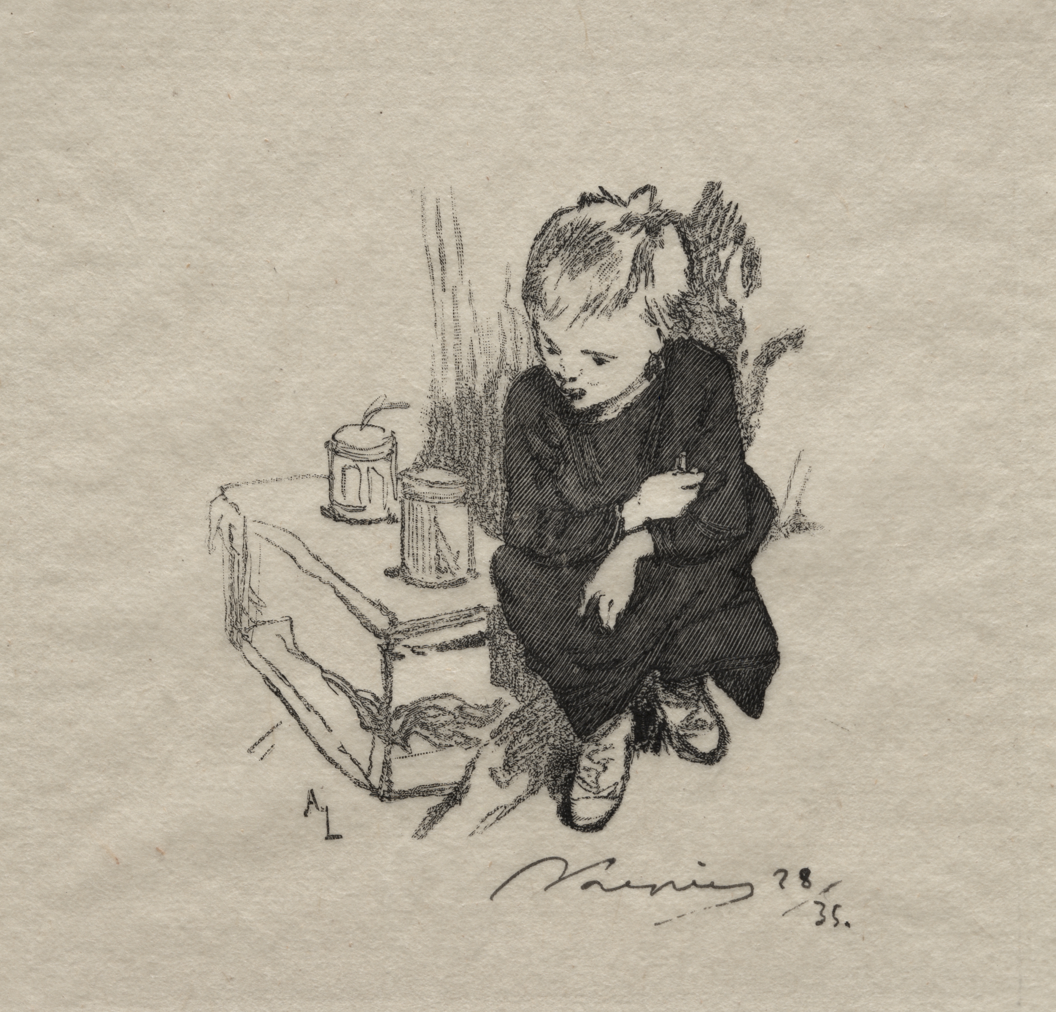 The image depicts a pencil drawing of a young girl in a black dress sitting on the floor. The girl has light-colored hair in pigtails. She wears a long-sleeved black dress and shoes. She sits on the floor with her knees bent up, and her arms are crossed. To her left is a small wooden table with a cylindrical container on top. The background of the drawing appears to be a plain surface, possibly paper or canvas. The drawing is rendered in shades of gray, with darker shading used to create depth and texture. The artist's signature and the year "78" are visible at the bottom of the drawing. The title of the piece is "Le gamin a l'orset" and it is attributed to Auguste Louis Lepère.