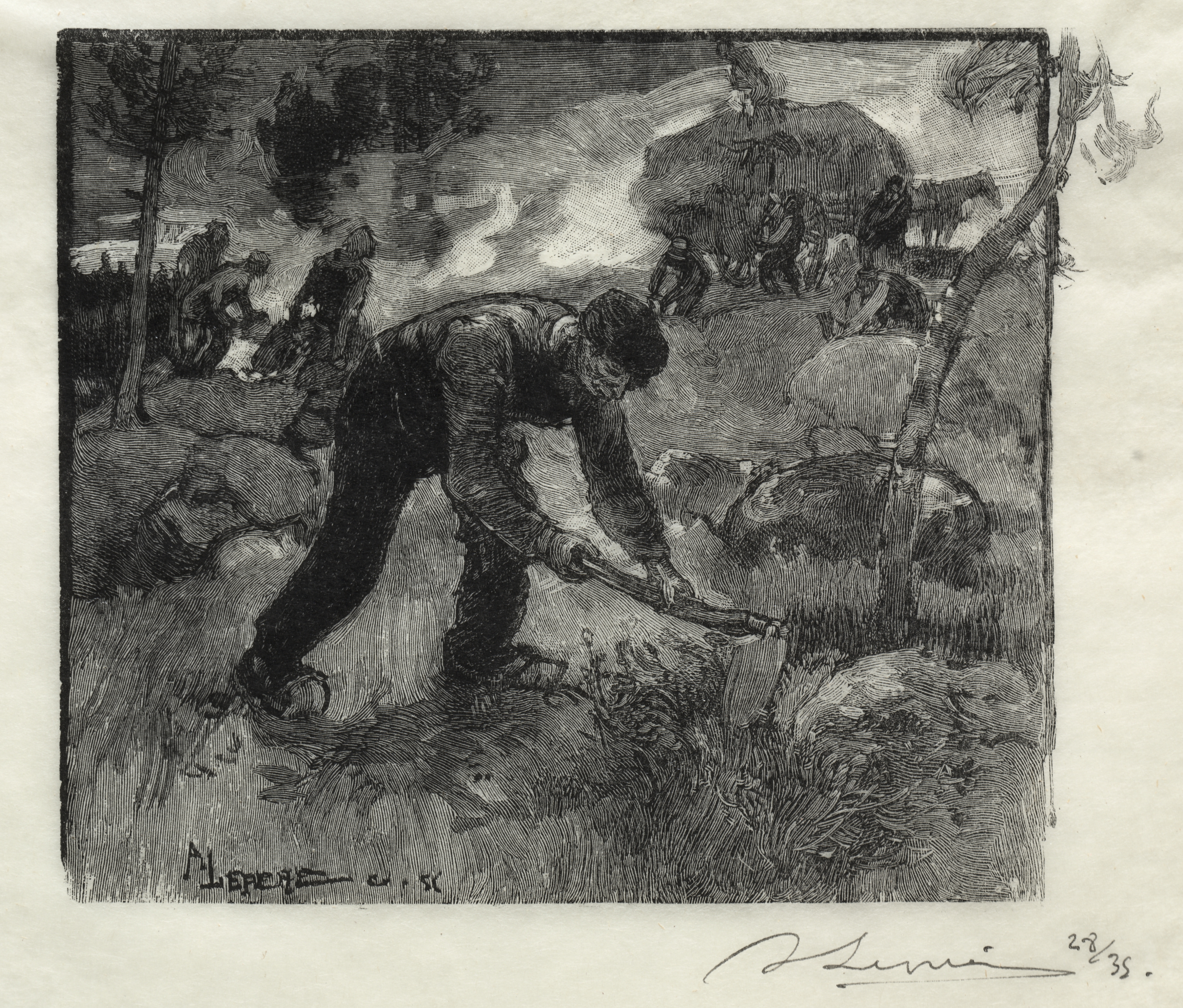 Black and white drawing of a man in a field using a tool to pull up plants. The man is wearing dark clothing and a hat, and is leaning forward with both hands on a long-handled tool. He appears to be pulling up a plant with the tool. There are other people and a horse in the background. There are trees and a large thatched roof structure. The sky is cloudy and dark. The artist's signature is in the bottom-right corner. The image is titled "Arracheurs de bruyères" by Auguste Louis Lepère.