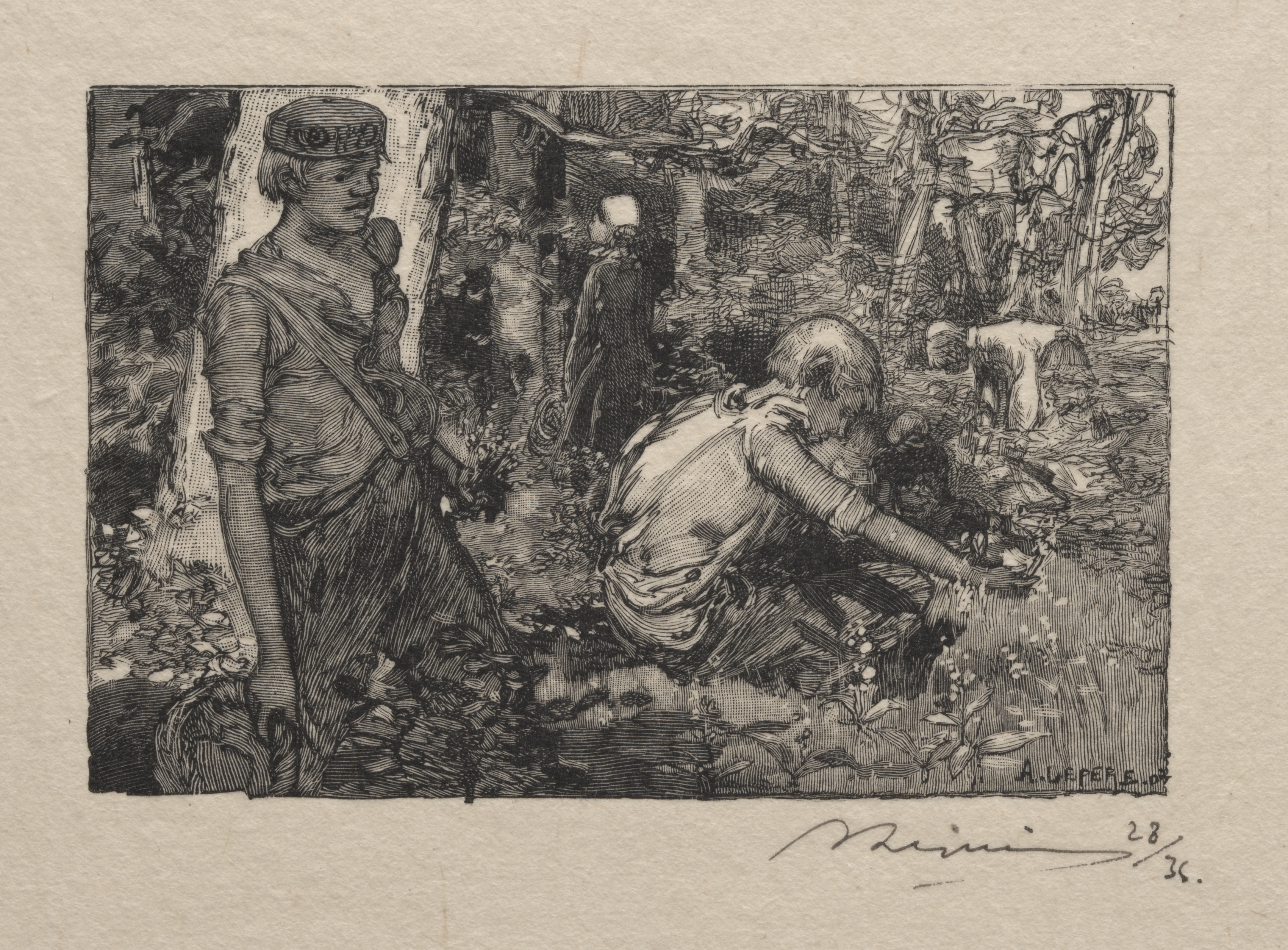 Black and white image of a man and woman outdoors. The man wears a white shirt; he bends toward the ground and faces right. The woman stands to his left; she wears a headband and a dress; her body faces forward and she looks right. The background shows trees and bushes. The image is framed with a border and there is a signature in the bottom right. The title is "Cueillette du muguet" and the artist is Auguste Louis Lepère.