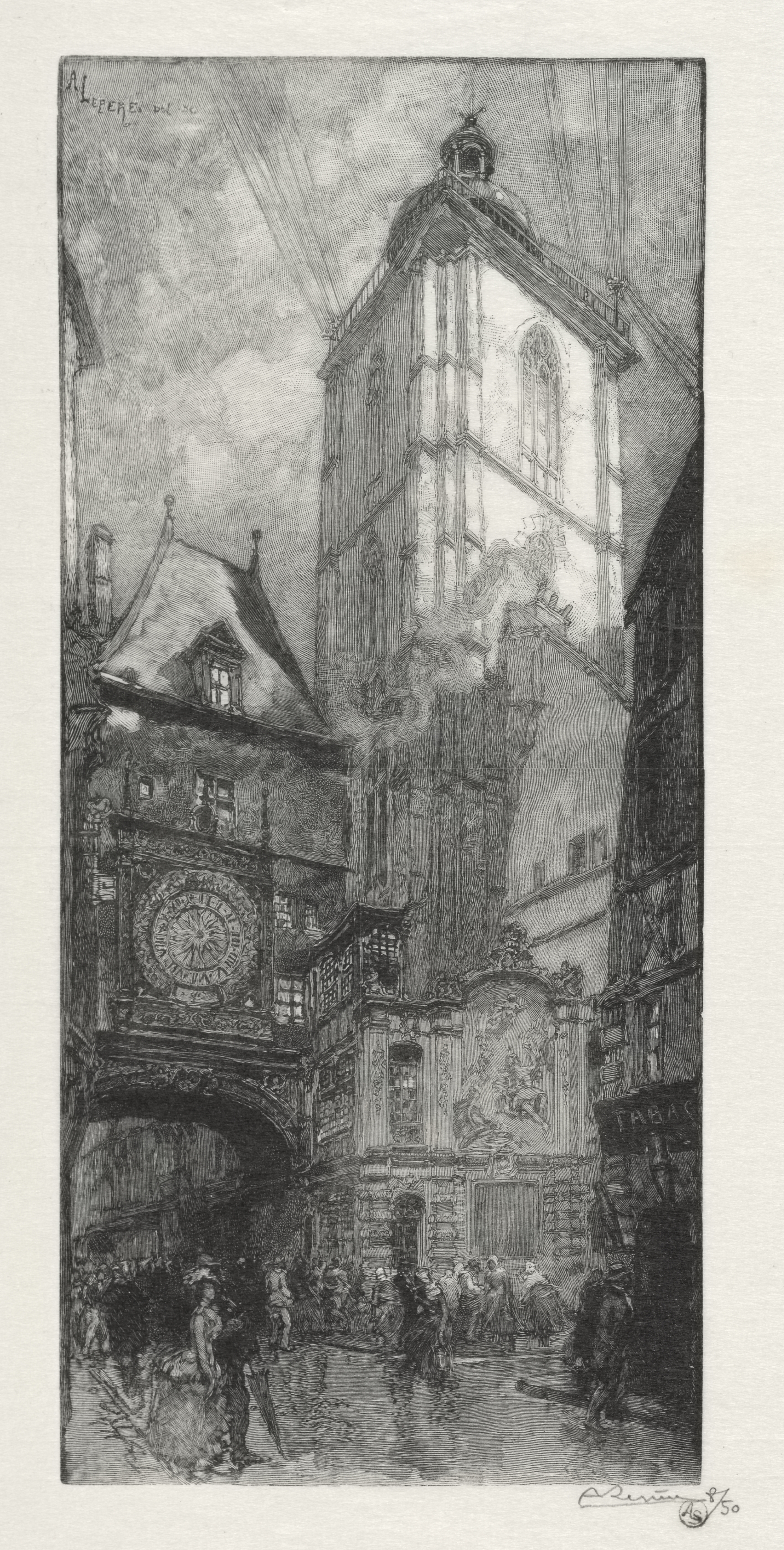 Black and white etching of a large clock tower on a building's facade, the clock on the left side; cobblestone street below with people; several other buildings visible; cloudy sky.