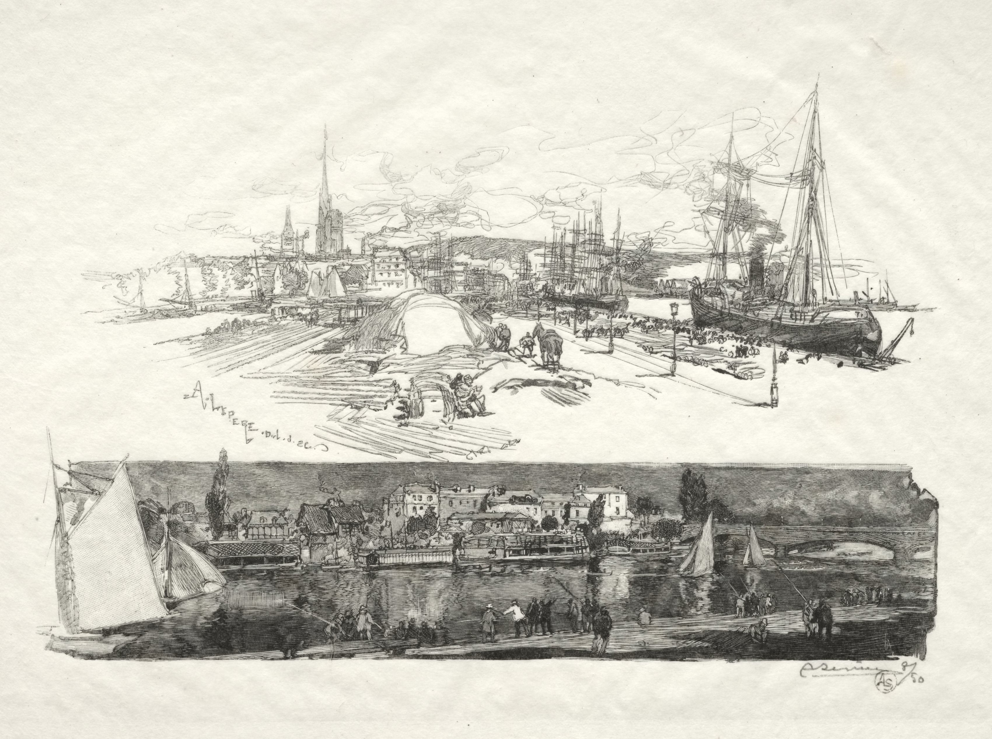 The image shows two black and white sketches of a waterfront scene. The top sketch depicts a large body of water with several boats and ships docked along the shore. A large pile of lumber is in the center of the sketch. There are several buildings in the background, including a church with a tall steeple. People are standing on the shore and on the boats. The bottom sketch shows a similar waterfront scene with a body of water and several boats. There are people standing on the shore and on the boats. Buildings line the shore in the background. Both sketches are done in a detailed, realistic style with many lines and shading. The artist's signature is visible in the bottom right corner of the lower sketch.