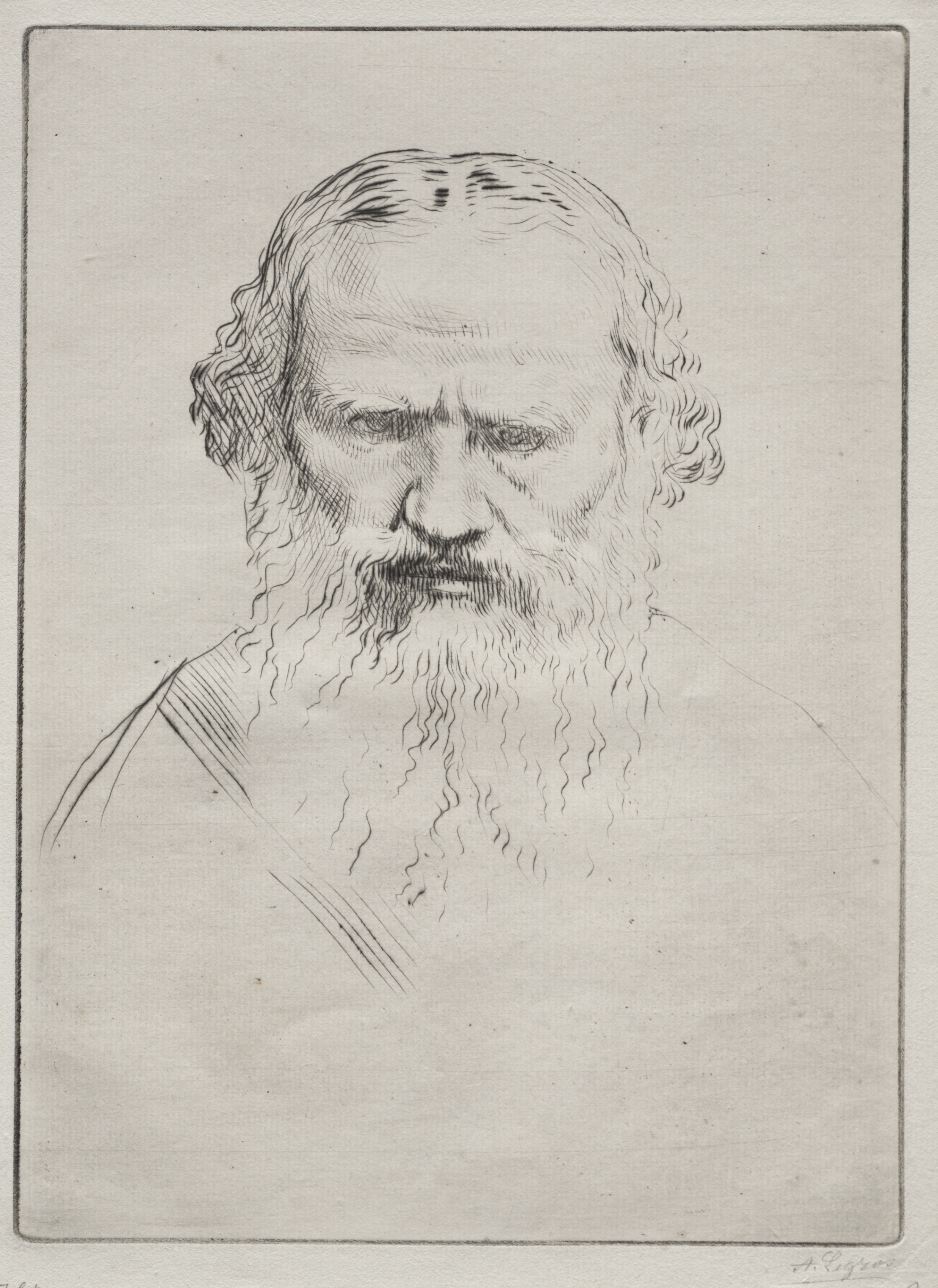The image depicts a black and white drawing of a man with a beard. The man has curly hair and a long beard. He wears a collared shirt. The drawing is in a rectangular frame with a thin line around the edge. The artist's signature appears in the bottom right corner. The background of the drawing is light gray. The subject of the drawing is Tolstoi, and it was created by Alphonse Legros.