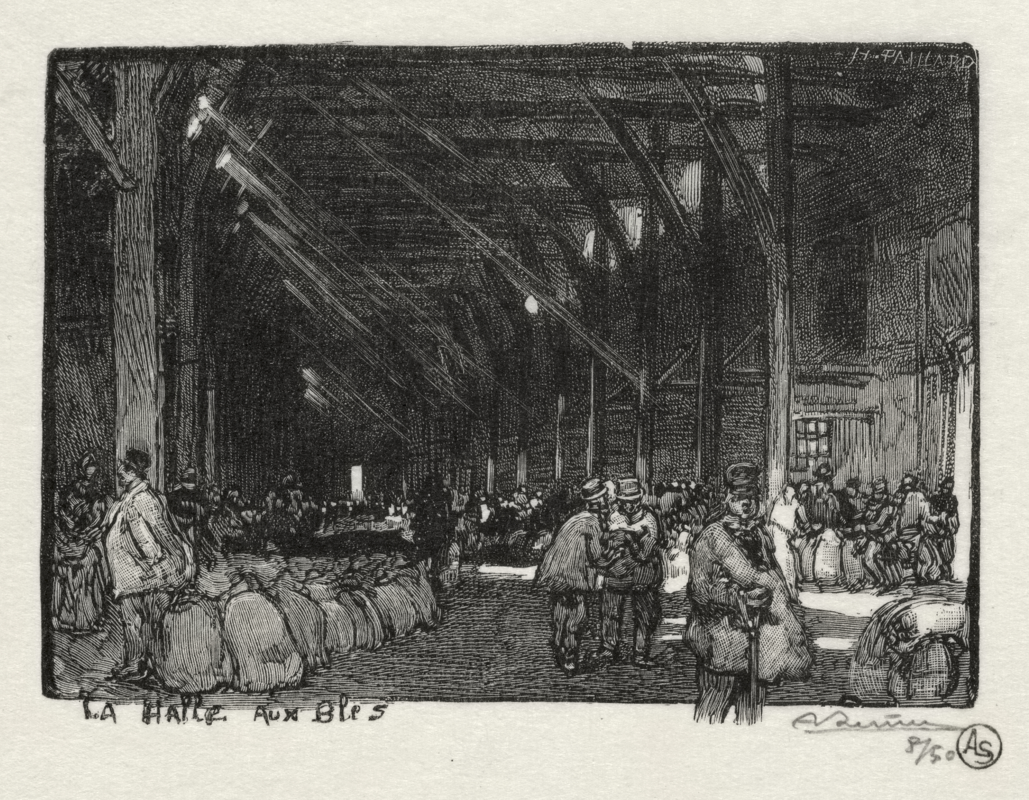Black and white drawing of a large warehouse interior. People gathered around stacks of sacks. High ceiling with exposed beams. Light sources hanging from ceiling. Wooden support columns. Window on right wall. Text at bottom left reads "LA HALLE AUX BLES". Signatures and numbers in bottom right corner.
