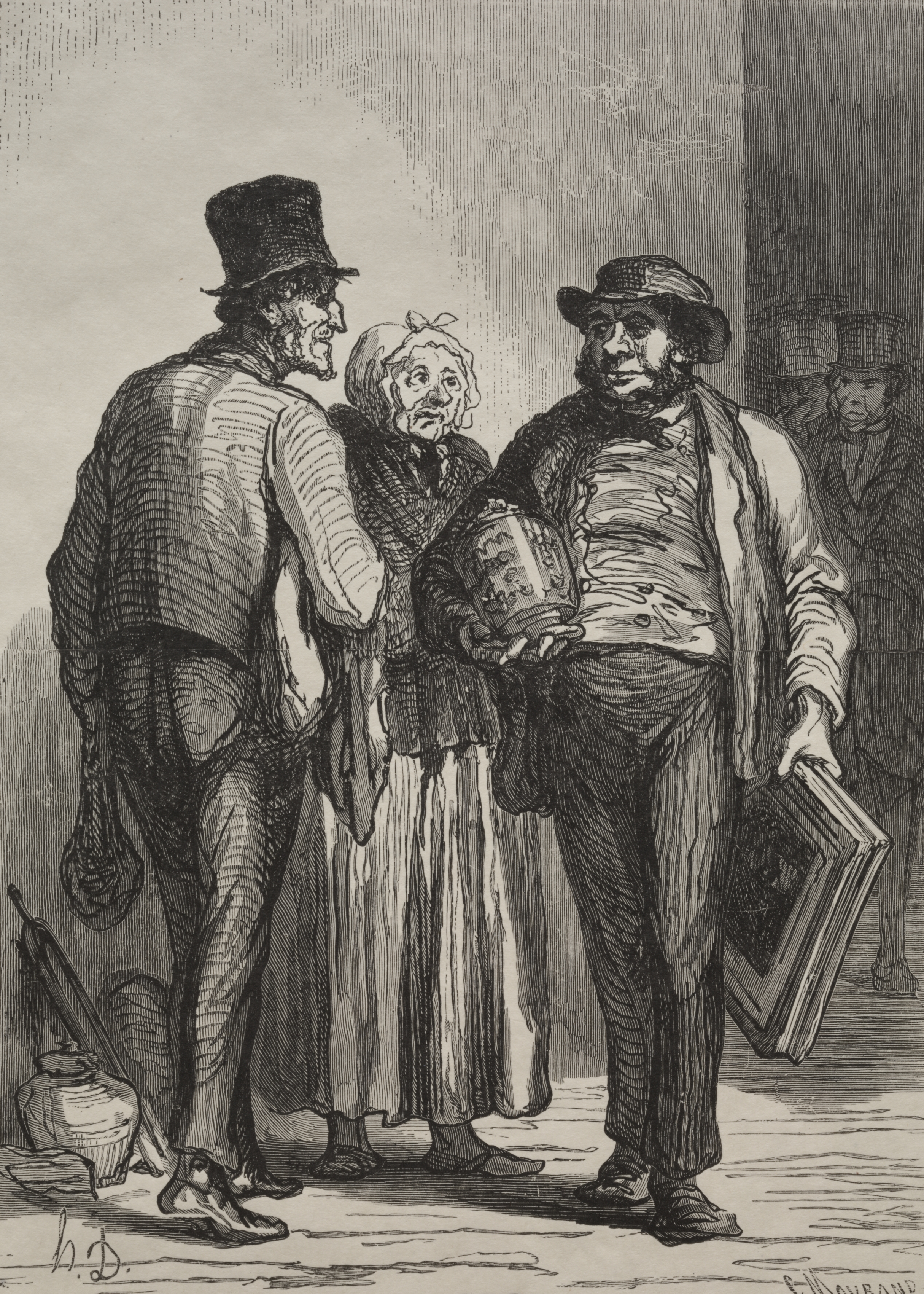 Black and white drawing of three people standing inside. The man on the left faces right. He wears a striped jacket, tall hat and holds an object in his right hand. The woman in the middle faces left. She wears long dress and head covering. The man on the right faces left. He wears an open jacket, hat, and holds a framed object in his left hand and another object against his body with his right hand. There are two people in the background on the right. There are objects on the floor on the left including a vase and shoes. The drawing is titled "The Auction House: The Dealers" and was made by Honoré Daumier.