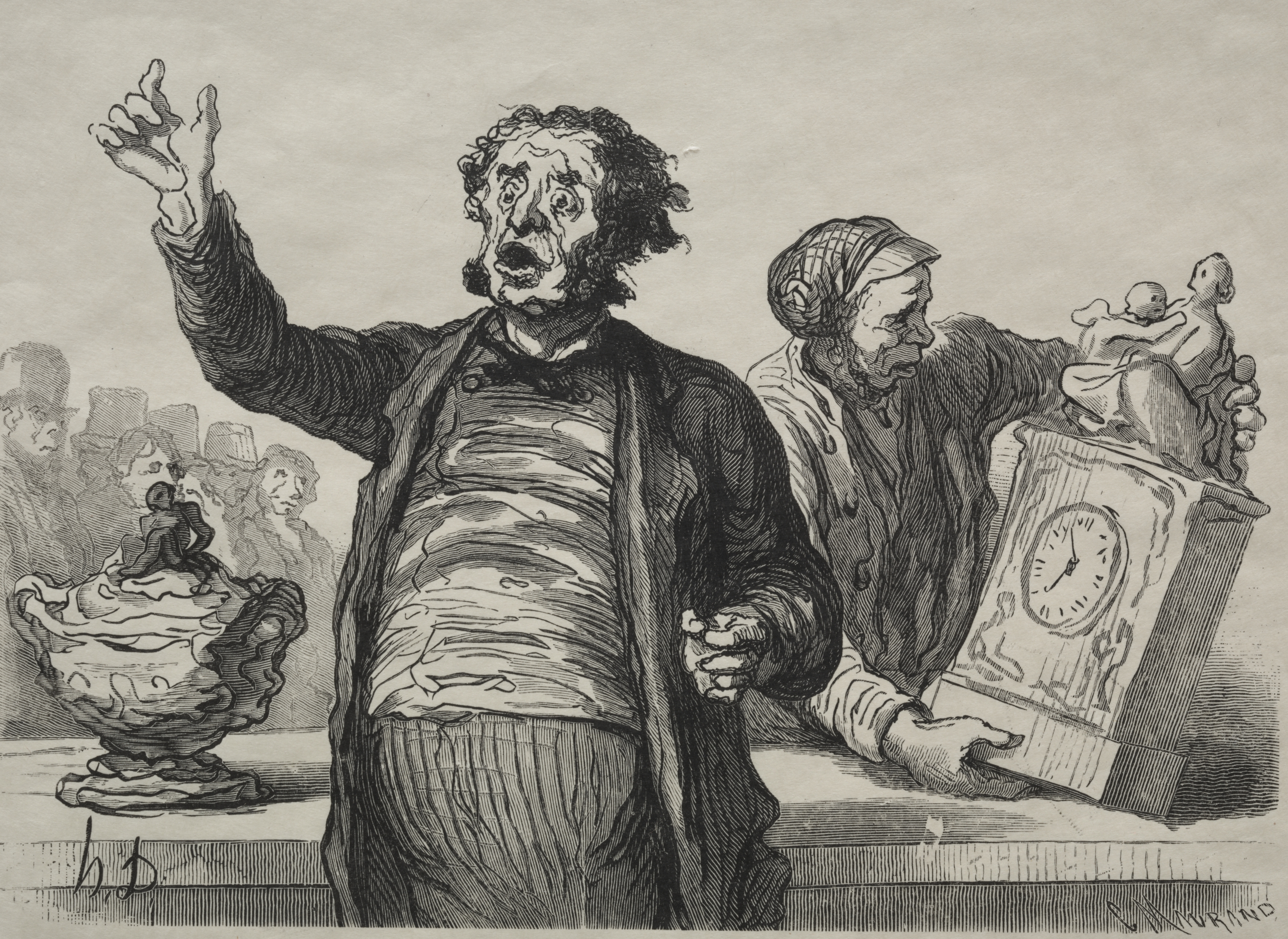 The image depicts a black and white drawing of a man standing with his right arm raised. He wears a dark jacket over a striped shirt and dark pants. His face is contorted and his mouth is open. To his right is a woman holding a clock and a nude doll. The clock is on a mantle and she appears to be placing the doll on top of it. On the left side of the man is a large ornate bowl with a lid. In the background, several people are visible. The artist's signature is in the bottom-right corner.
