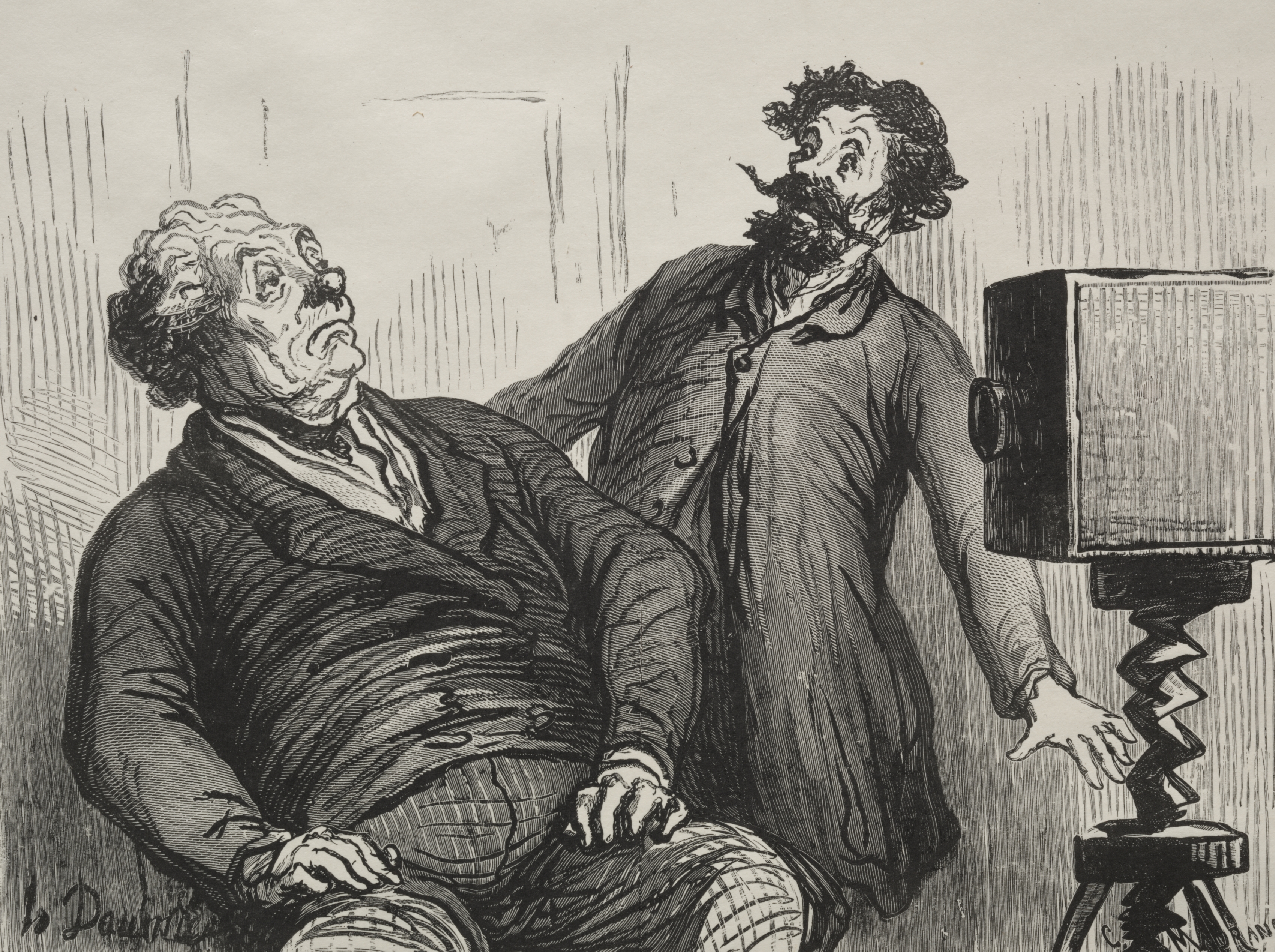 Black and white drawing of two men, one sitting and one standing behind. The sitting man has thinning gray hair, a round face, and a large body. He wears a dark jacket with a lighter colored shirt underneath and plaid pants. The standing man behind him has curly dark hair and a thick mustache. He wears a dark long-sleeved shirt. The standing man looks to the left while the seated man looks up and to the right. To the right of the standing man is a large box-like object on a stand. The artist's signature appears in the lower-left corner. The background has vertical lines. The title of the piece is "Photographers and Photographed" by Honoré Daumier.