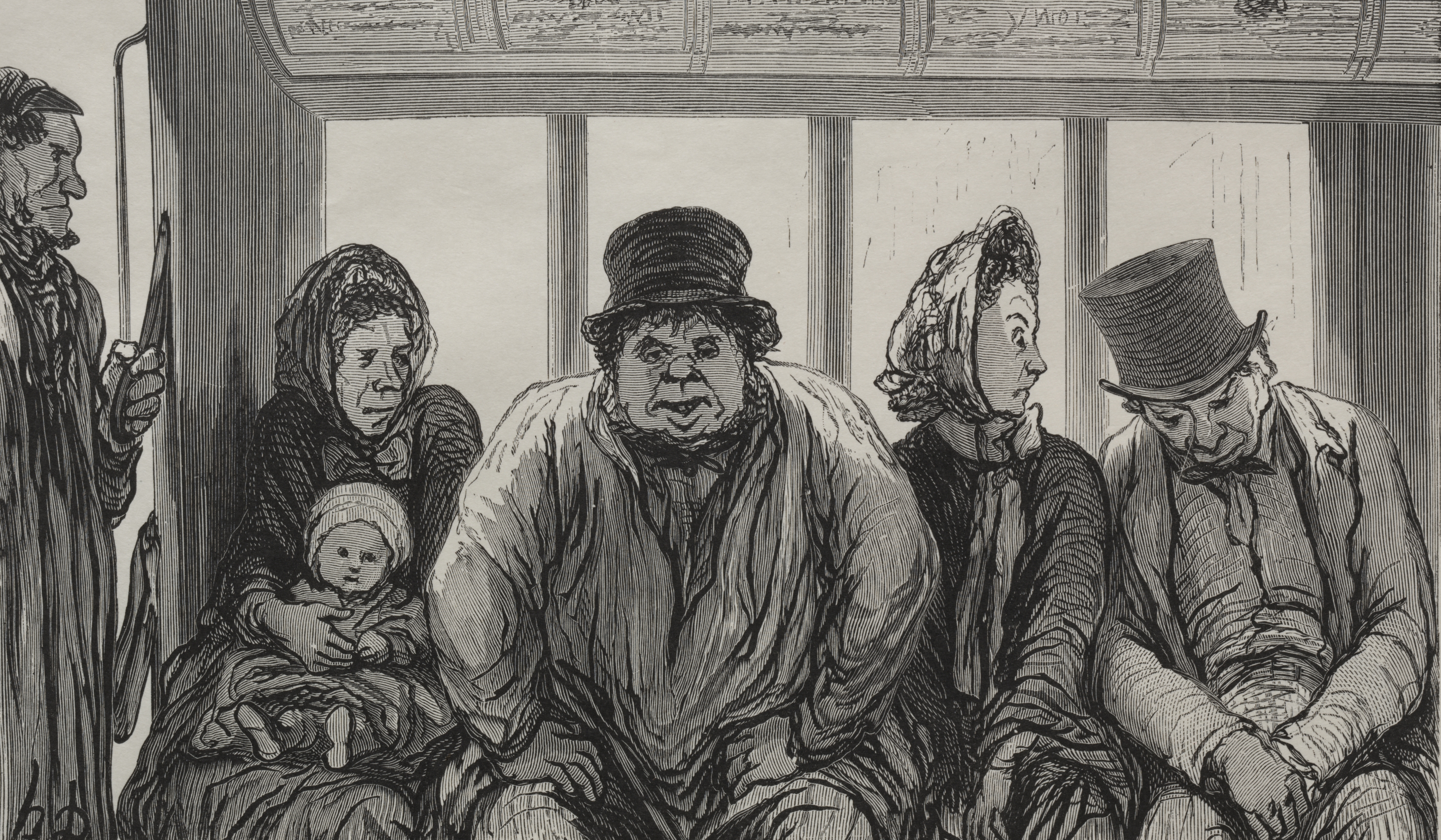 Black and white drawing of people sitting in a bus. A man stands on the left. He wears a long coat and holds a stick. A woman sits on the left with a baby on her lap; she wears a head covering. A man in a top hat sits in the center, and a woman in a head covering sits to his right. A man in a top hat sits on the right; he looks down. The people are indoors next to a row of windows. The man on the left stands next to a pole. The drawing has heavy shading and lines.