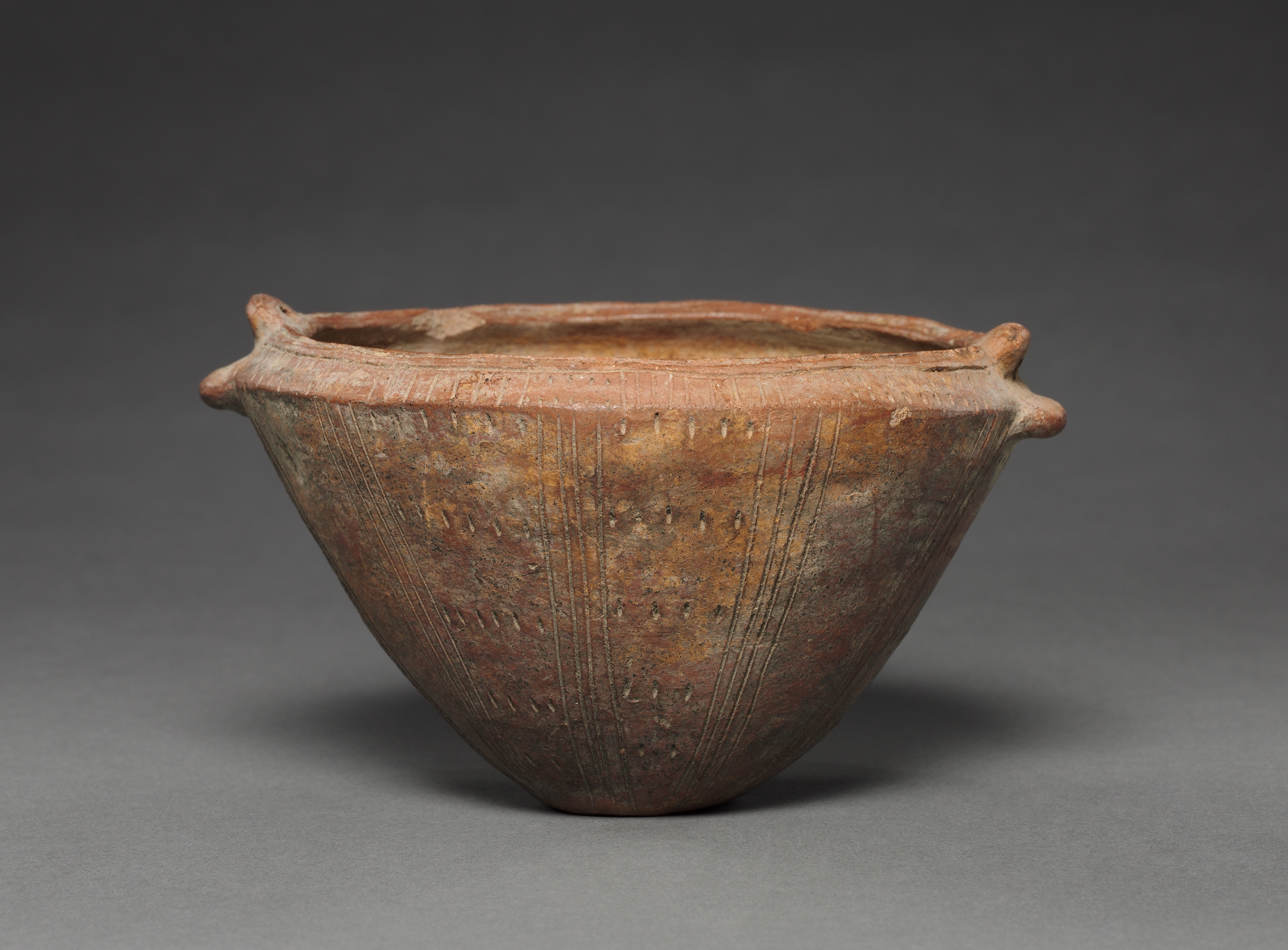 Dish, a brown ceramic bowl with two small handles on either side near the top, featuring vertical lines and dots etched into its exterior surface, set against a gray background.