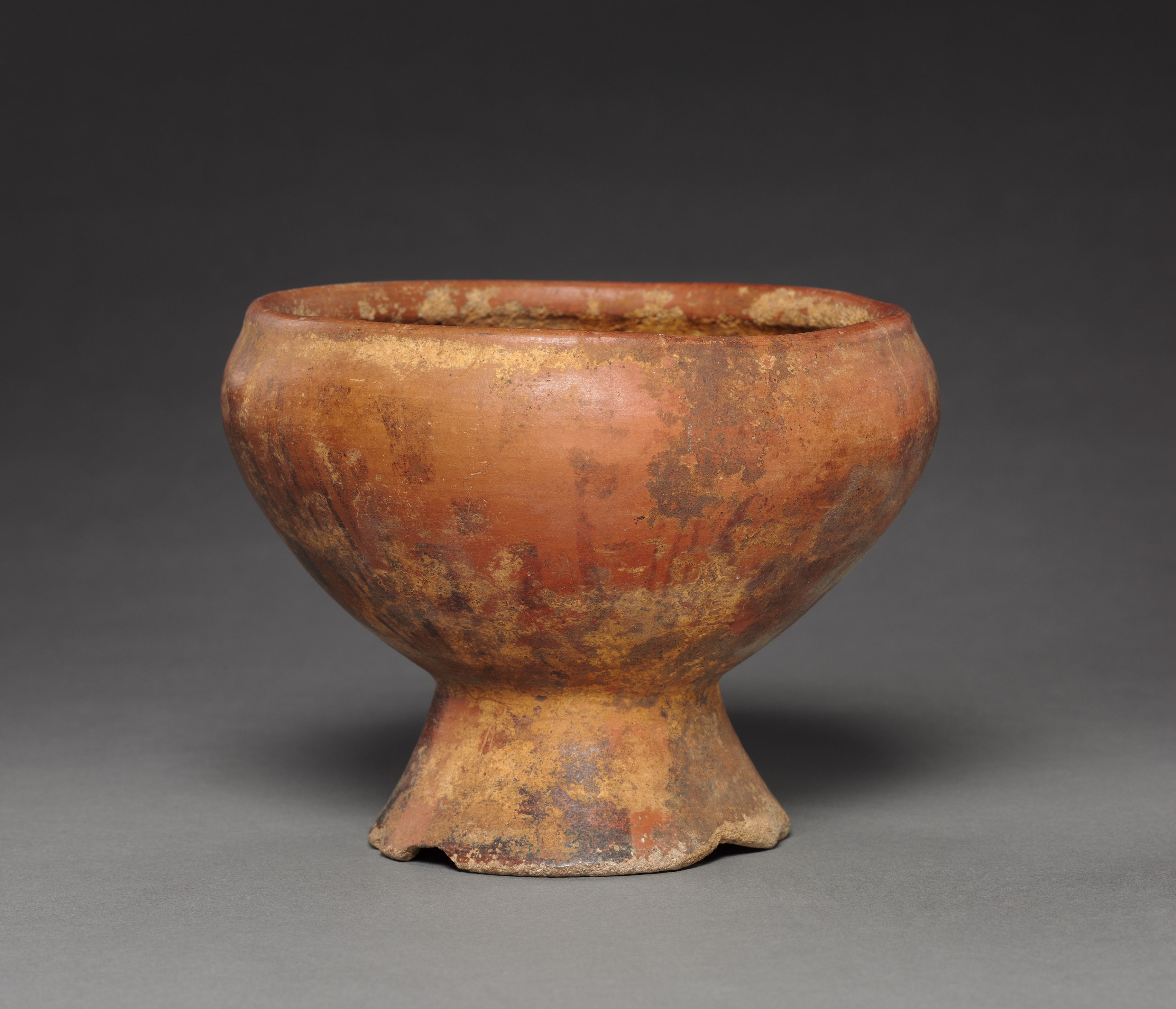 The Vase by artist not specified is a terracotta vessel with a wide mouth and a narrow, flared base that has three small feet. The body of the vase is rounded and bulbous. It has a predominantly reddish-brown color with patches of darker brown and lighter beige, giving it a weathered appearance. The surface shows signs of aging and wear, with visible cracks and discoloration. The background of the image is a gradient that transitions from dark gray at the top to light gray at the bottom, and the vase casts a shadow on the surface below it.