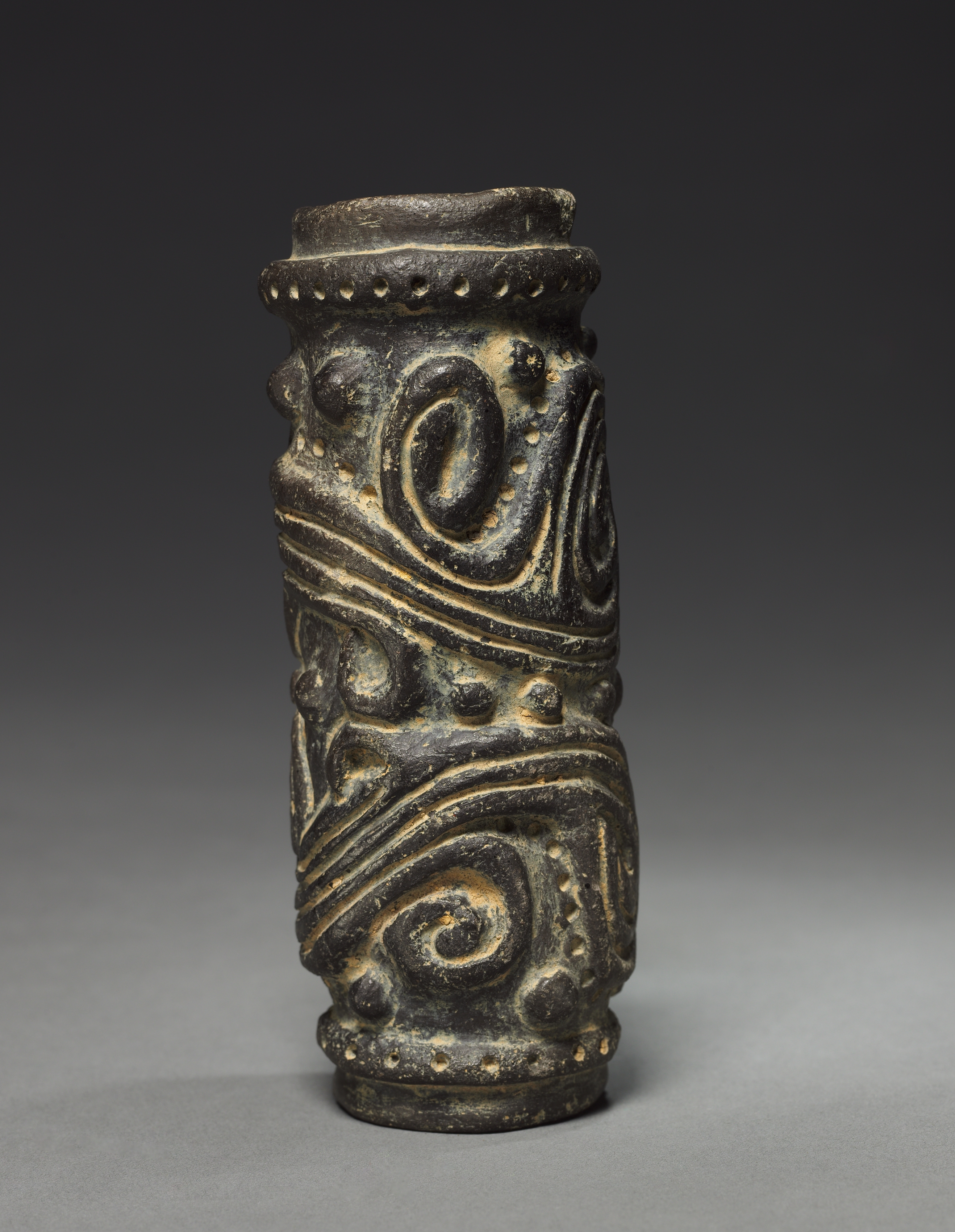 Cylindrical object with dark brown color and lighter brown accents. Object has a flat top and bottom. The top has a short rim with small triangle-shaped notches. The body features a pattern of curved lines and swirls. The pattern includes rounded protrusions and wavy lines. The background is dark gray at the top and light gray at the bottom with the object casting a shadow. Title: Roller Stamp. Artist: unidentified.