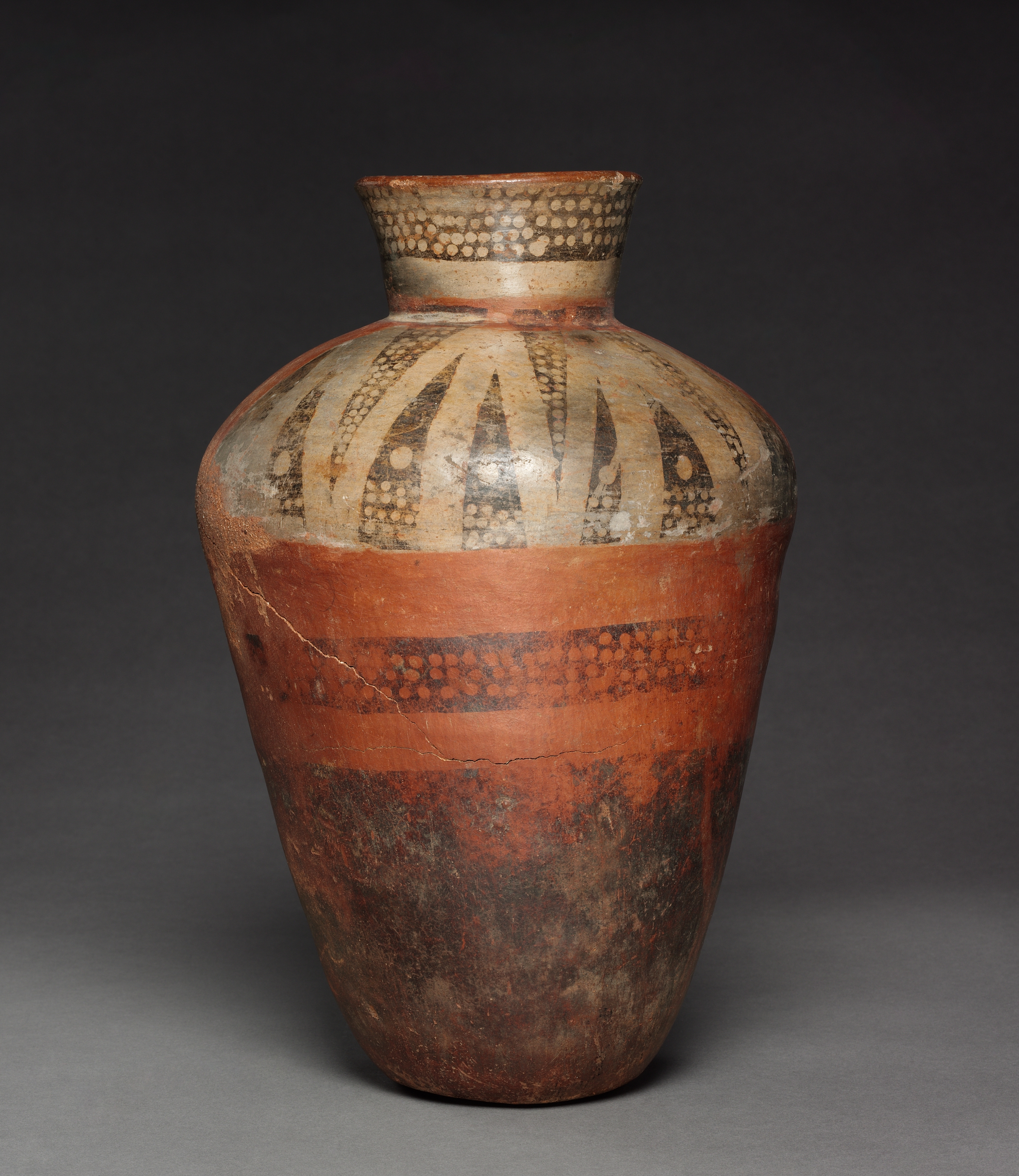 The image depicts a Vase by an unknown artist. The vase is made of clay and features a wide body that tapers towards the bottom, with a narrow opening at the top. The vase has a predominantly brown color with a lighter brown and beige top section. The top section features a pattern of triangular shapes pointing downwards, alternating with solid beige sections. A band of small circular patterns encircles the vase below the top section. Another band of small circular patterns is located near the middle of the vase, on a reddish-brown section. The bottom section of the vase is a darker brown color. The background of the image is dark gray, with a lighter gray surface that the vase is sitting on. The vase appears to have a crack running down one side. The overall appearance suggests it is an old, handmade piece of pottery.
