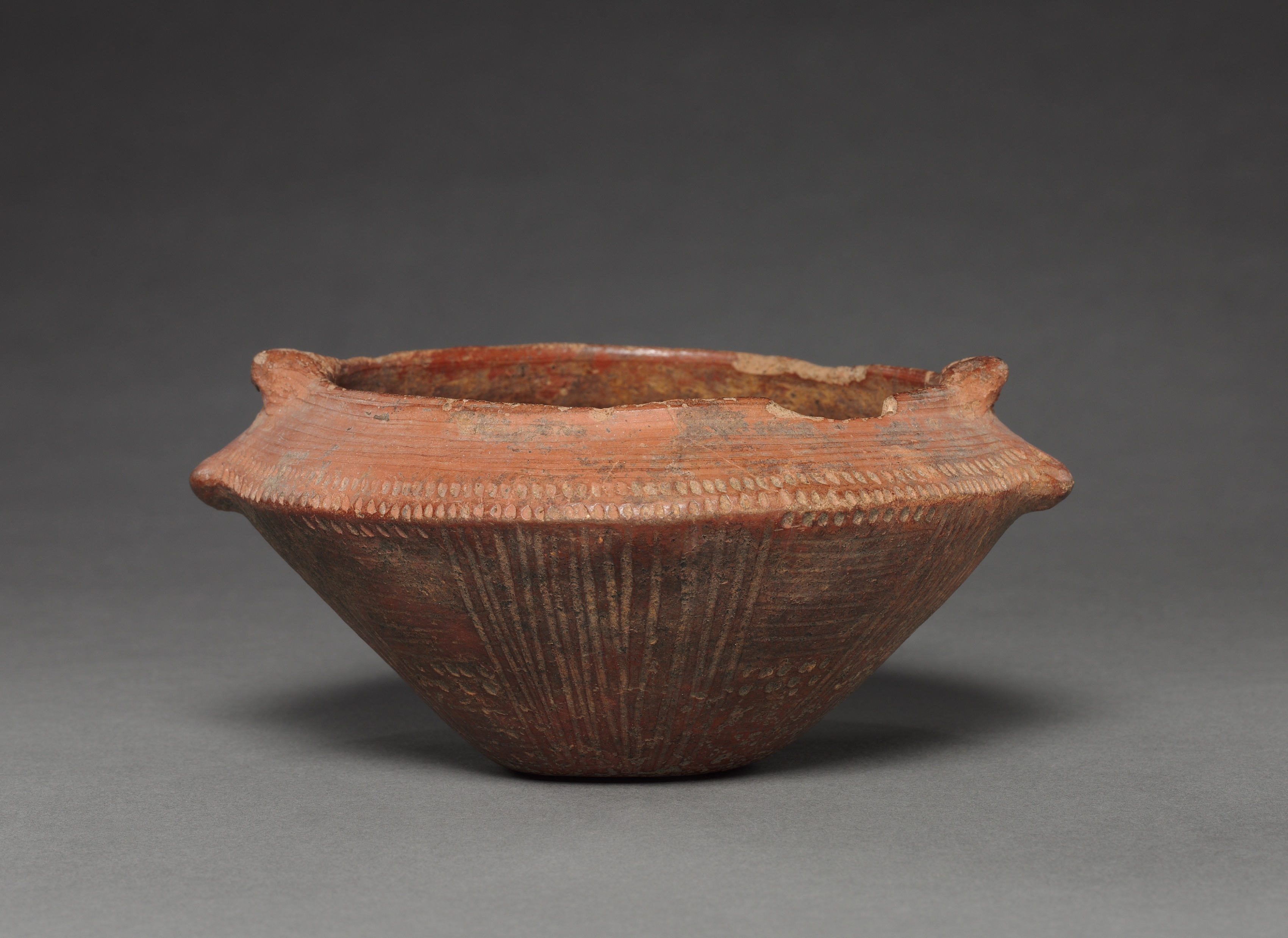 Reddish-brown clay bowl with wide mouth and short neck. Two small, rounded handles on either side of rim. Vertical lines and dots carved into exterior. Gray background. The title of the piece is "Dish".