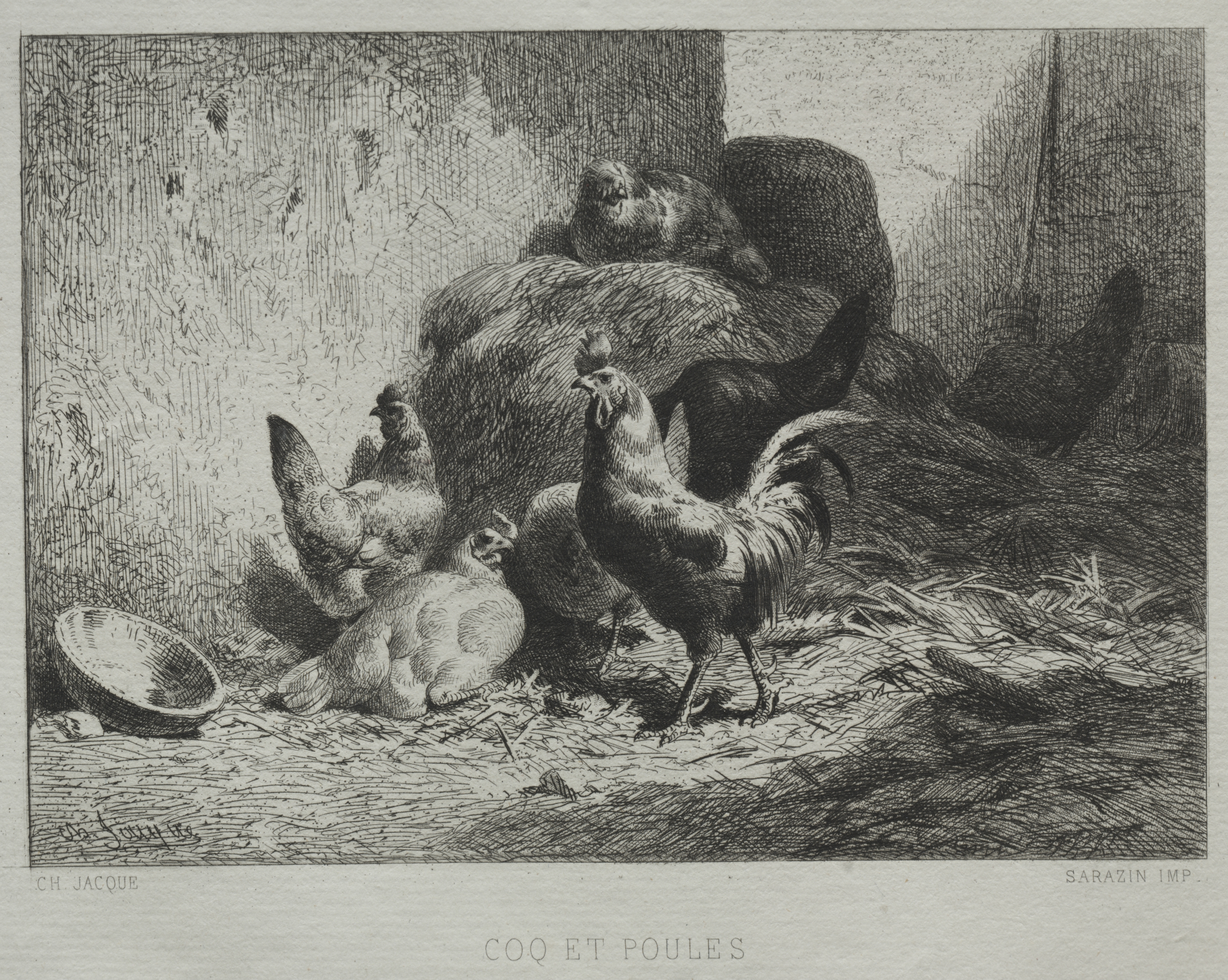 Black and white image of chickens and a rooster. The rooster stands center, facing left. Four hens are present, one lying down on the left, another standing behind the rooster, and two more to the left. The background shows a wall made of rough concrete or stone, with a stack of hay behind the birds. A bowl sits on the ground to the left. The floor appears to be dirt or straw. The image has a caption at the bottom: "COQ ET POULES". The artist's name is printed at the bottom left and another name is printed at the bottom right. The image is bordered with a light gray frame.
