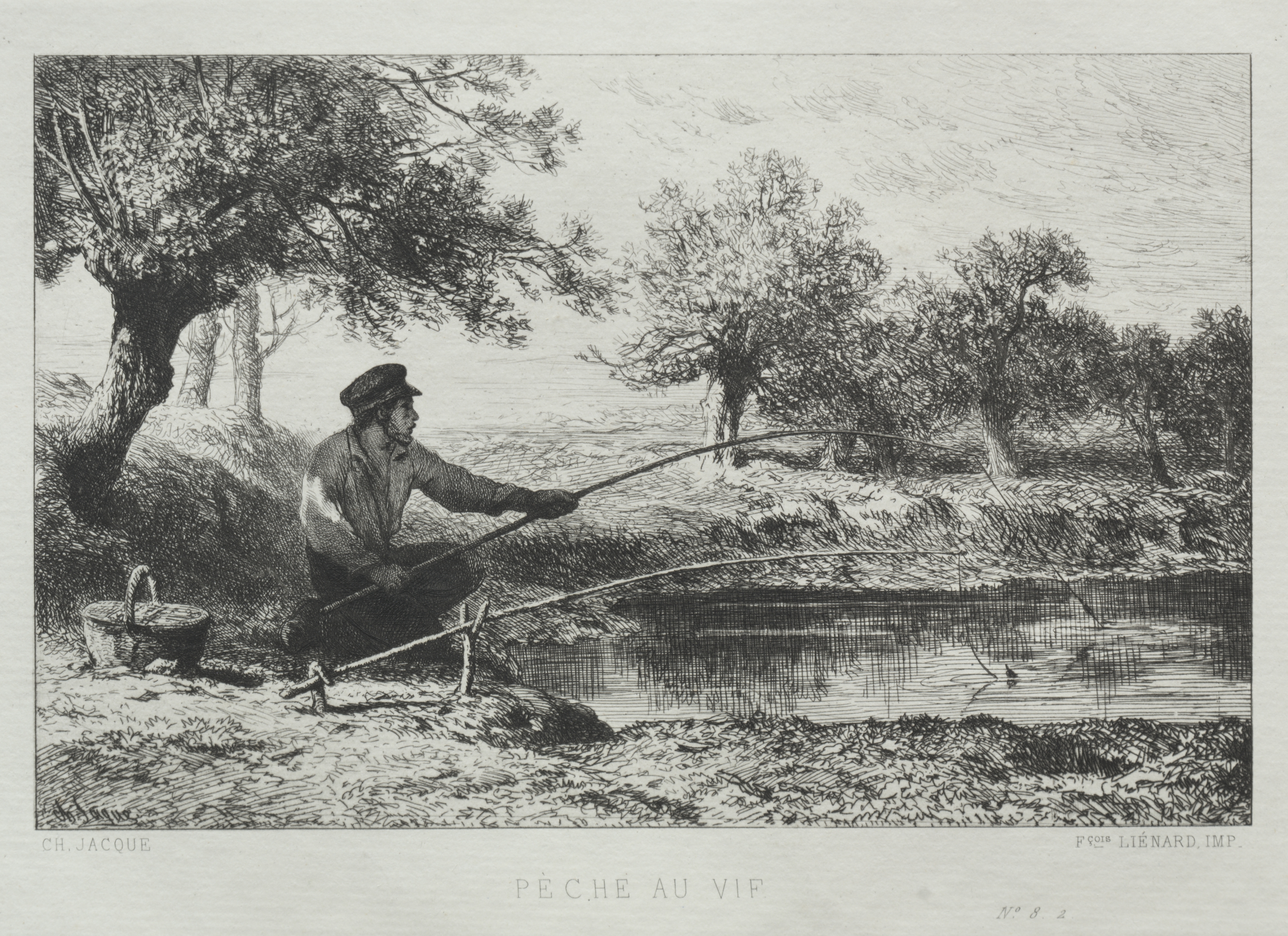 Black and white image of a man fishing. The man sits on a rock on the left bank of a small body of water. He wears a flat cap, jacket, and pants. A wicker basket sits on the ground beside him. His body faces right as he looks across the water. His right arm bends to hold a long fishing pole. The man casts his line towards the middle of the water. A tree grows on the bank beside him on the left. Its roots form a low hill. Further right trees grow on a higher bank. The sky is light, with darker lines suggesting clouds. Text along the bottom reads 'Pêche au vif'.