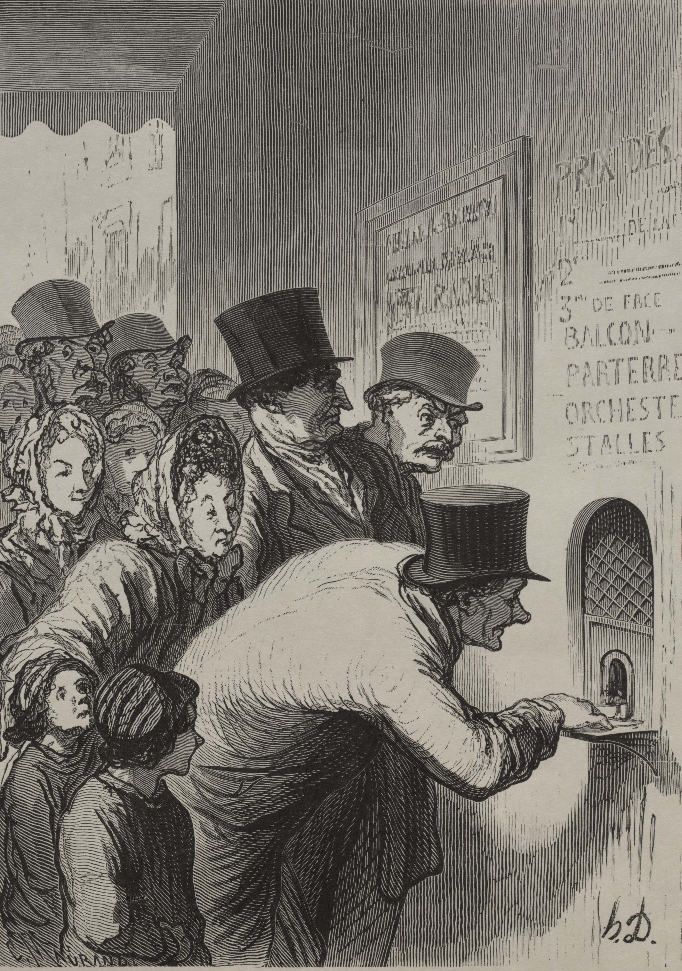 The image depicts a black and white drawing of people in a line at a box office. A man in a white shirt and black top hat is at the front, leaning over to purchase tickets. He is shown from the back and side. A man in a dark suit and top hat stands behind him to the right. A group of people in old-fashioned clothing are to the left. Some wear headscarves and hats. A large sign on the wall to the right lists ticket prices and seating. A smaller sign is on the wall to the left. The background shows a wall and a window. The image is drawn by Honoré Daumier and titled "The Box Office at the Theater".