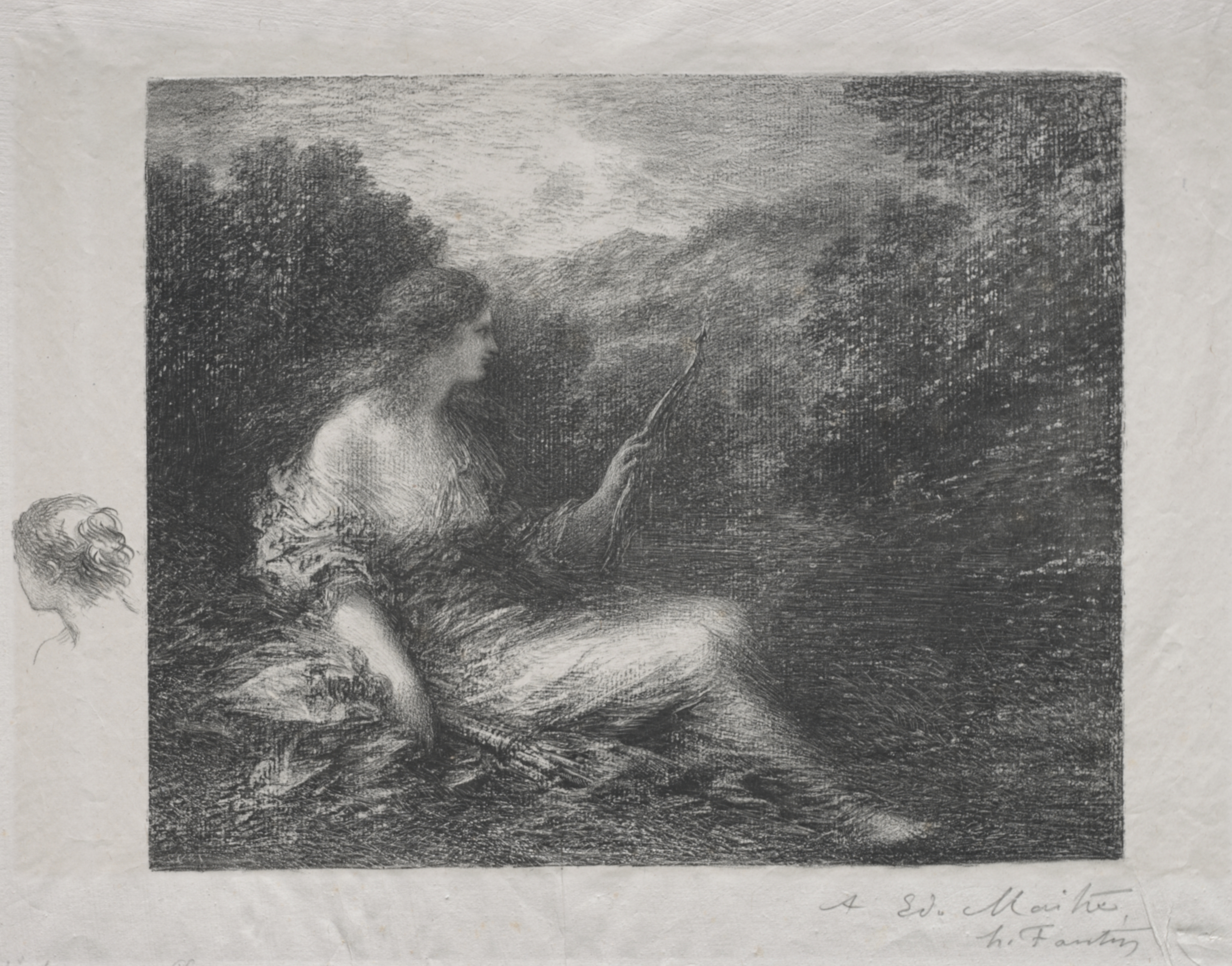 The Huntress by Henri Fantin-Latour: A black and white etching of a woman sitting on a rocky outcropping, wearing a flowing dress, holding a bow and arrow, with her body facing right and her head turned to the right. Her hair is dark and pulled back. She sits in front of a wooded area and what appears to be a body of water. A small sketch of the back of a woman's head is to the left of the main image. The background of the main image features trees and a cloudy sky. The overall scene is rendered in detailed, textured shading.