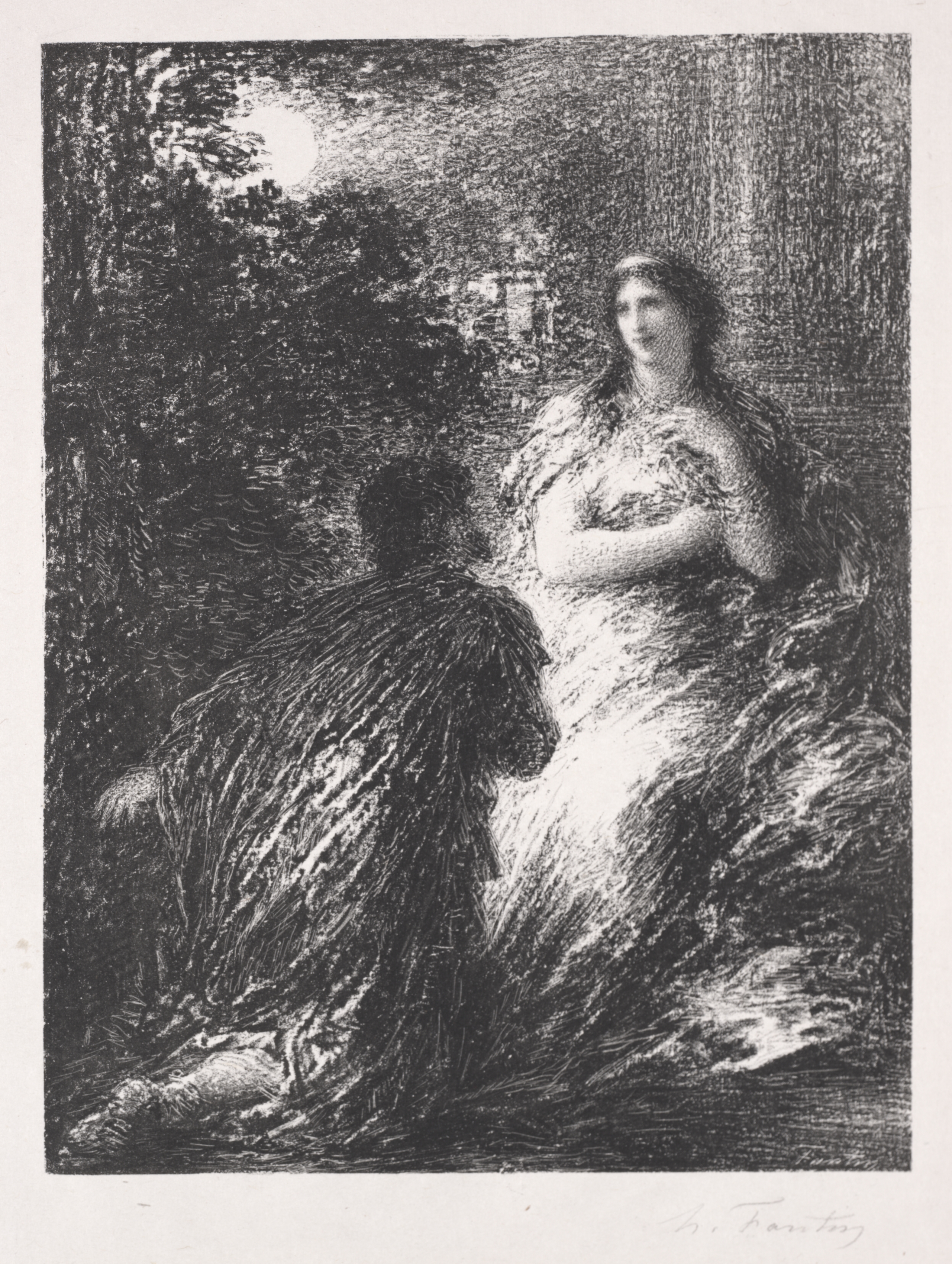 Black and white image of two people in a garden or park. A woman sits on a low rise or mound, wearing a white dress with a low neckline and short sleeves. Her left elbow rests on her knee and her hand is near her face. A man sits on a lower level in a dark, loose-fitting outfit. He faces the woman with his back to the viewer. The woman looks at the man. Behind them are trees, foliage and a wall. The name "H. Fantin" is written in cursive at the bottom.