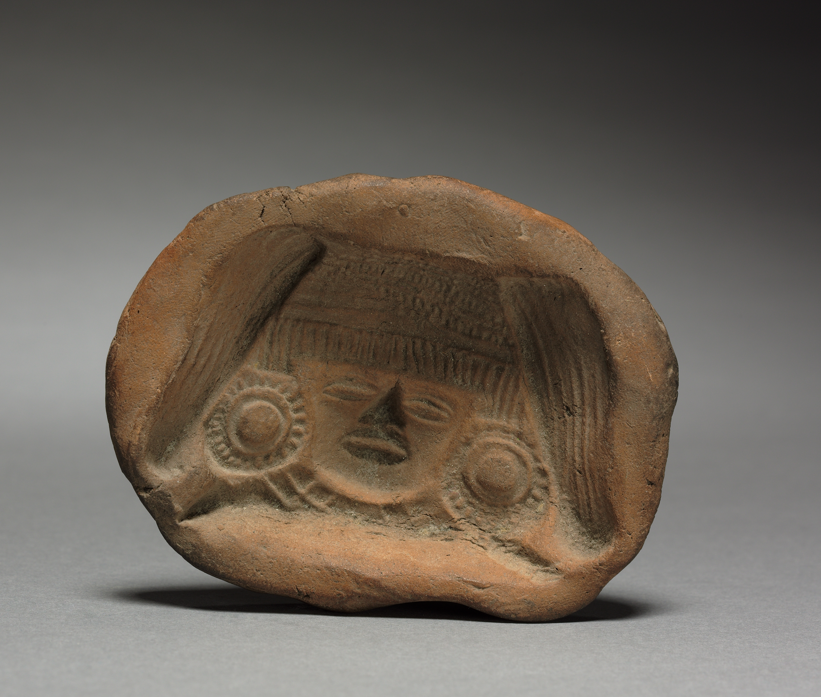 The image depicts a clay object titled Mold by an unknown artist. The object is made of reddish-brown clay and has a rough, uneven shape. It is roughly oval in shape with a hollowed-out interior. The exterior surface is textured and has several small holes and imperfections. The interior surface features a carved design that resembles a face with a prominent nose and circular eyes. The face is surrounded by a decorative border. The background of the image is a gradient of dark gray at the top to light gray at the bottom. The object casts a shadow on the surface below it.