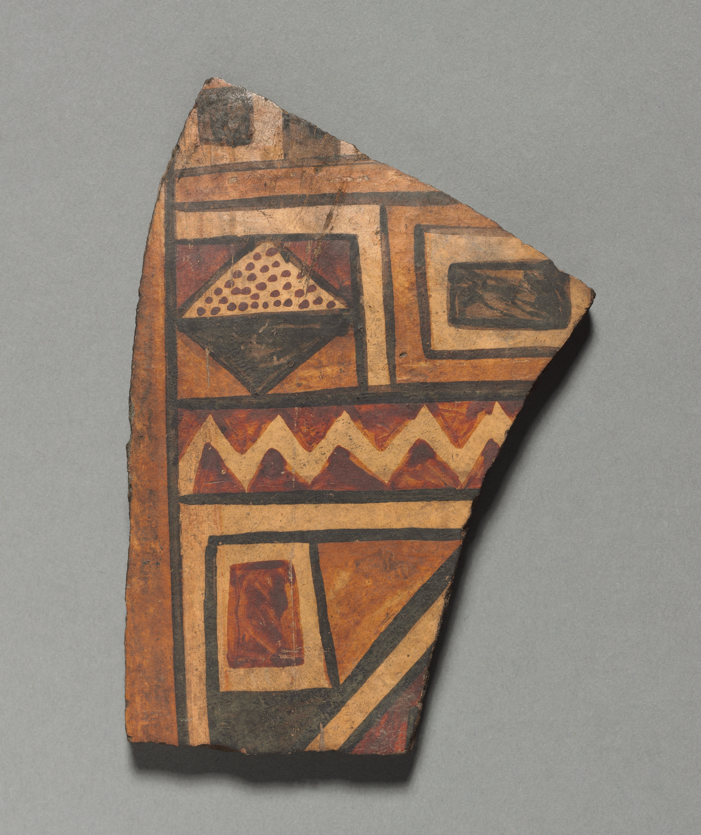 Fragment by Unknown Artist: The image shows a broken piece of pottery with a geometric design. The piece is irregularly shaped with one curved side and jagged edges. The design on the pottery includes various shapes, such as triangles, squares, and zigzags, in shades of brown, beige, and black. The background of the image is a solid gray color.