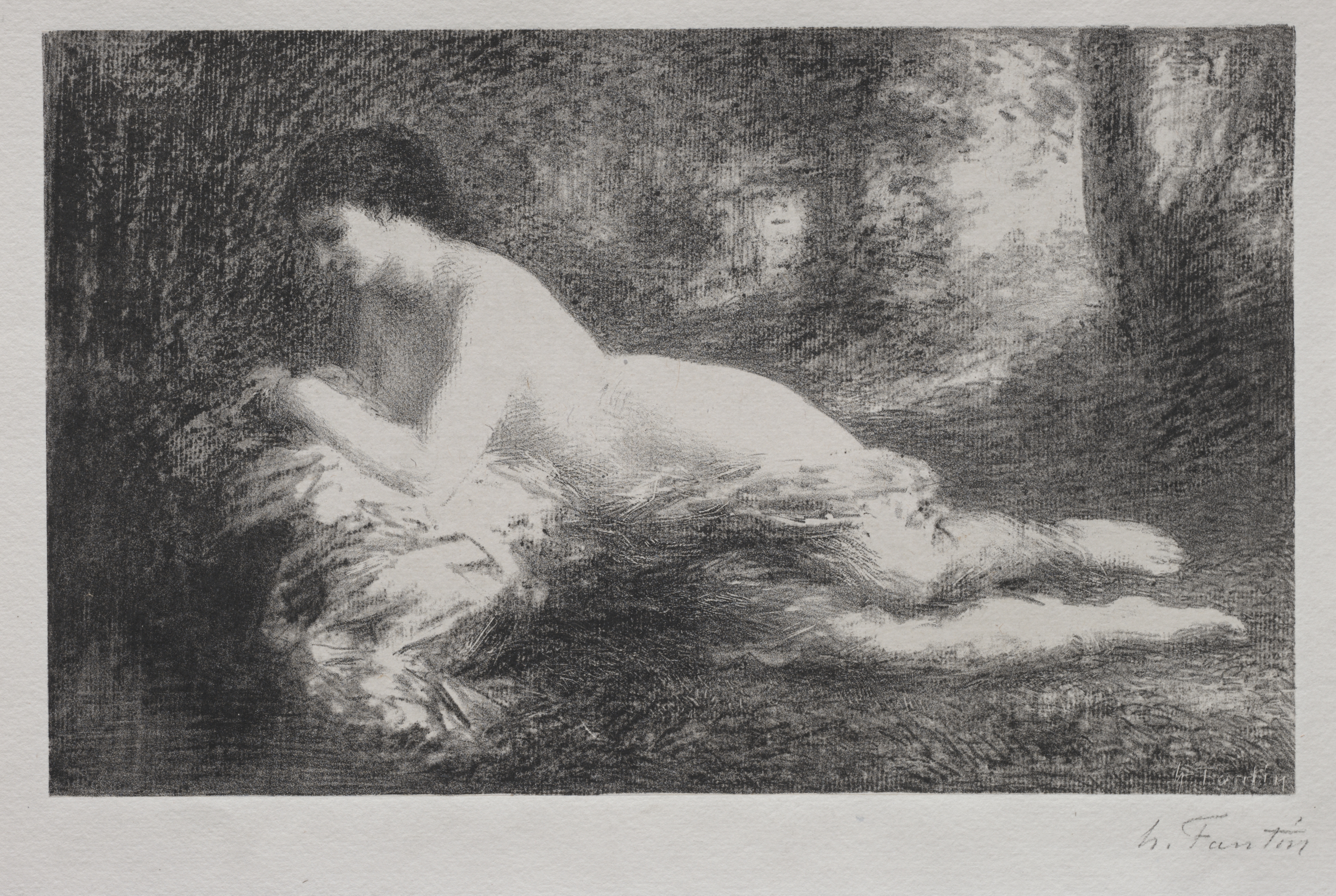 Black and white still life. A woman reclines on the ground. She sits on her right side with her back to the viewer. Her head rests on her left arm. She has short hair. A cloth covers her from the waist down. The background appears to be a natural setting with dark foliage. The image is signed in the lower-right corner. The title is "Reverie" and the artist is Henri Fantin-Latour.