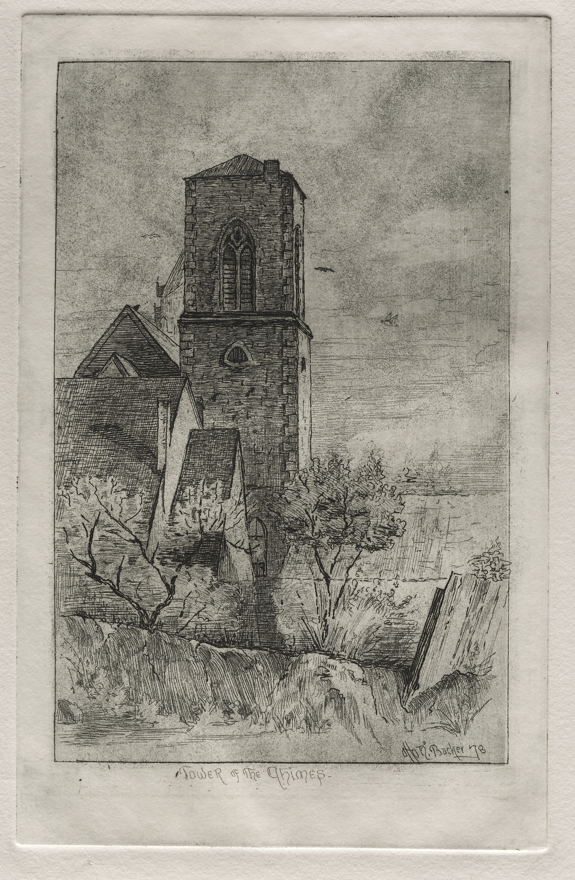 Black and white drawing of a tower made of brick with one large gothic-arch window; smaller gothic-arch window underneath; square with a peaked roof at top; thin trees and grass in front. The tower is positioned on right side of the image, and there is a house with two peaked roofs on the left. The title, "Tower of the Chimes," is written in a fancy font along the bottom. The artist's signature appears in the bottom-right corner. The image fades to white around the edges. The tower and house appear to be made of brick. There are birds flying in the background sky.