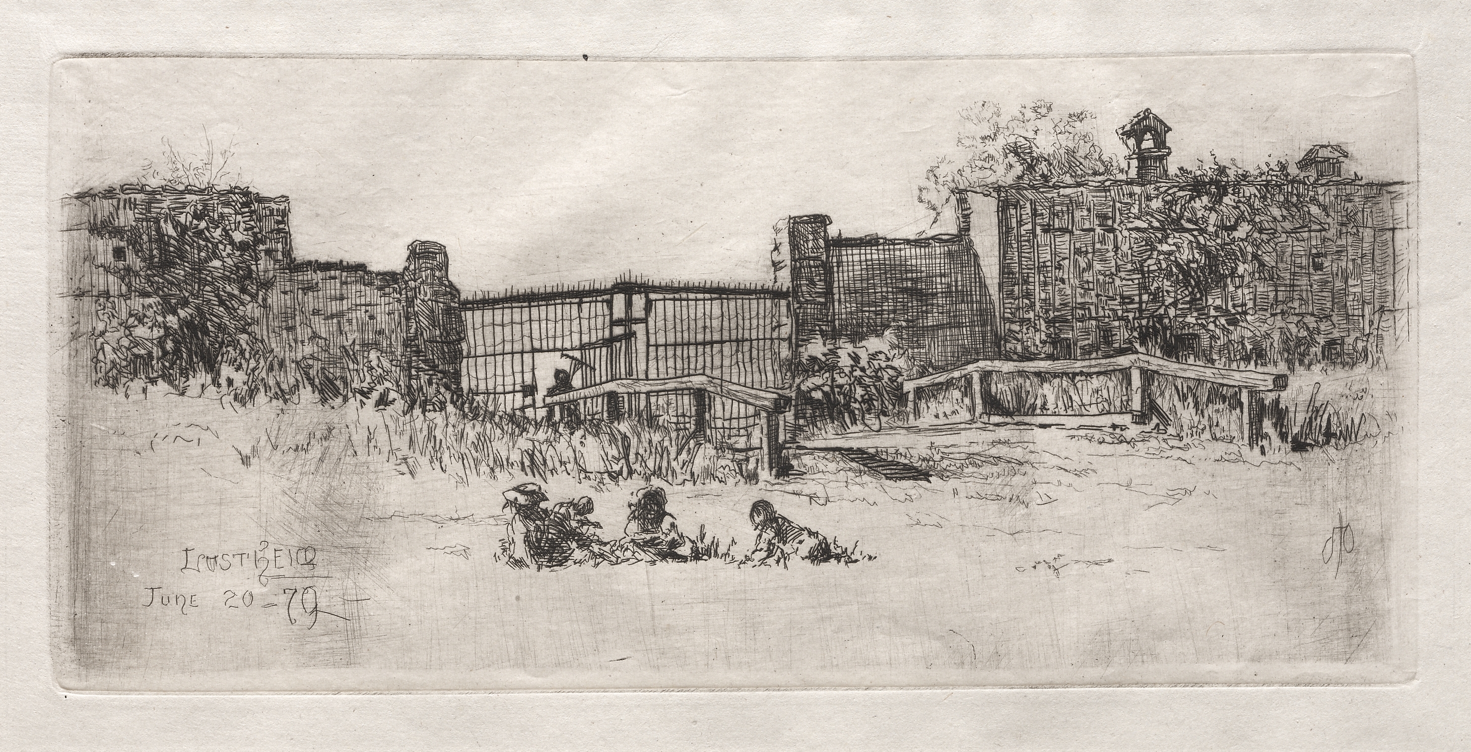 The Gate, Lustheim by Otto H. Bacher: A black and white sketch of a gate in a stone wall with a dirt road and grassy area in the foreground. Three children sit on the ground in the foreground. A fence with a gate spans the center. The wall on the right has a tower and a house on top. The wall on the left is lower and more overgrown. The sky is light gray. A date is written in the bottom left corner: June 20 '79.