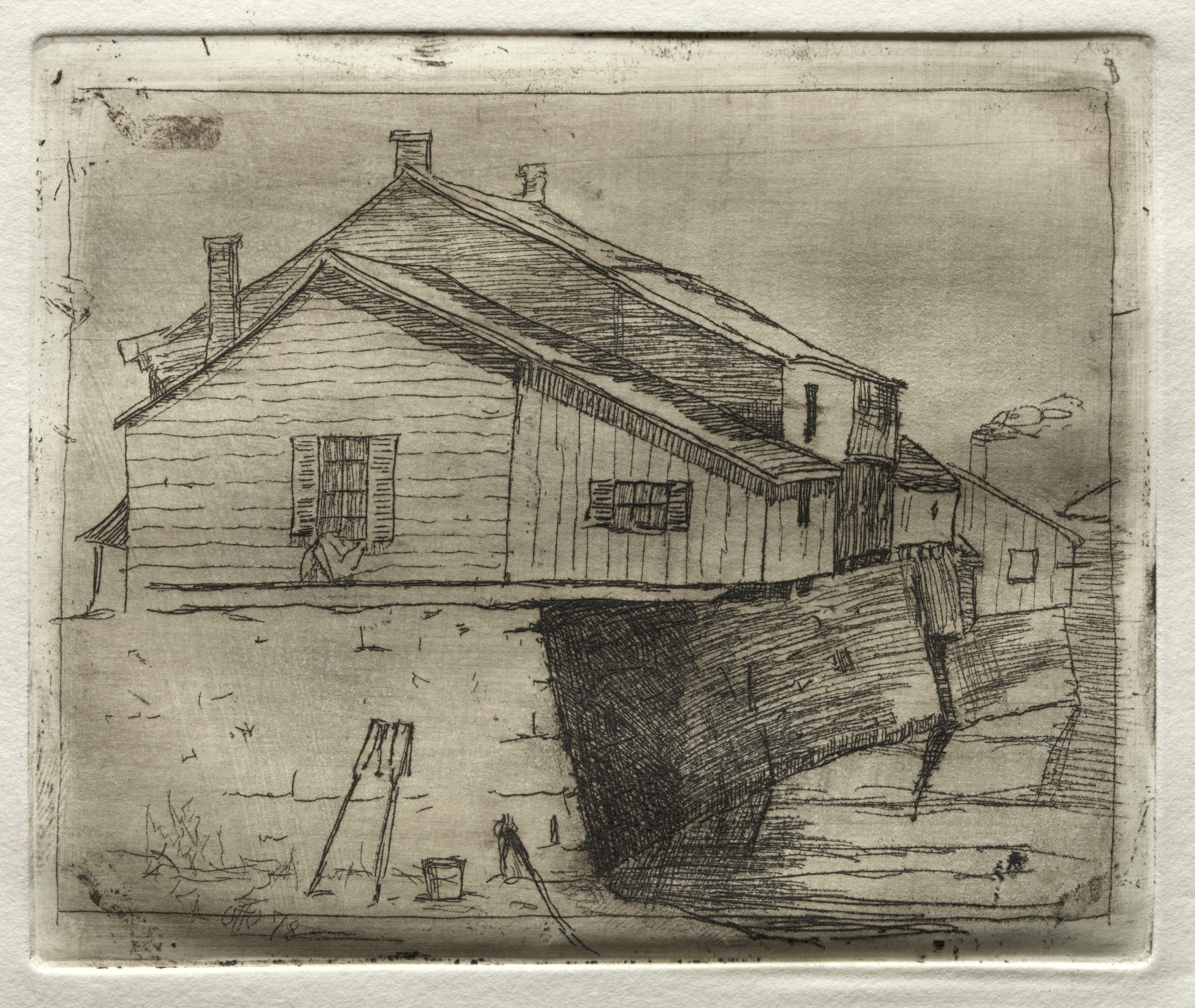 The image depicts a black and white sketch of a house over water by Otto H. Bacher. The house has a gable roof with two chimneys. The house has horizontal siding and two windows with shutters. A smaller building is to the right. The house appears to be built on pilings over the water. There is a bucket and an easel in the foreground. The sky is clear. The image is a monochromatic drawing with heavy shading and lines.