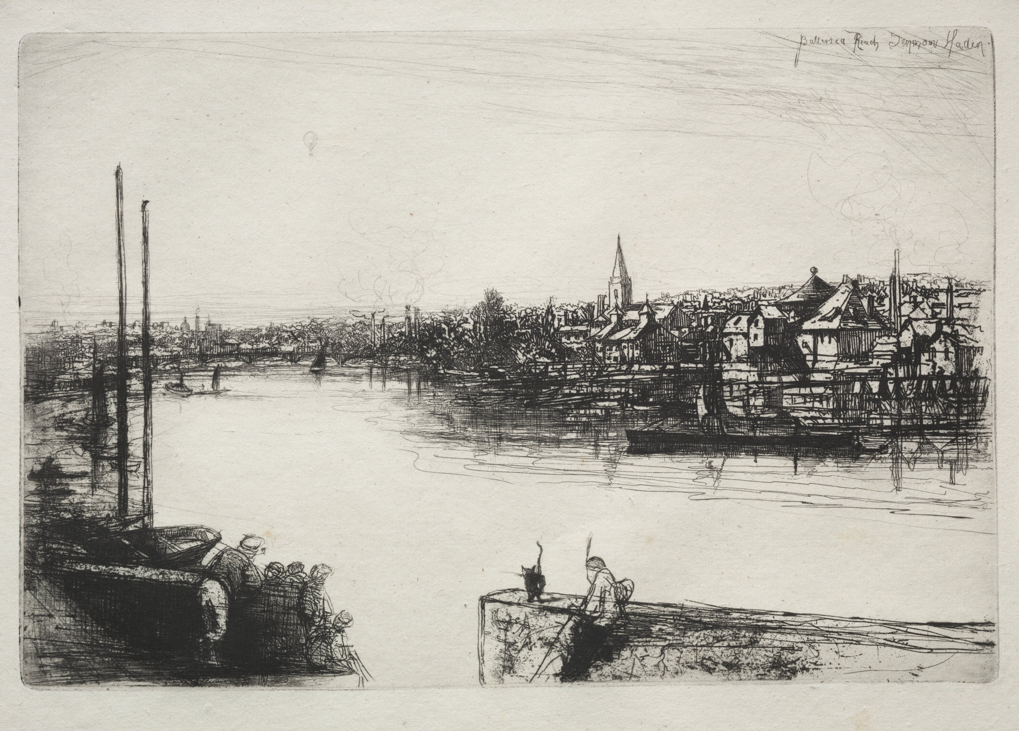 Black and white etching of a river scene with a town on the right side. The riverbank on the right side has a low wall with a person and a cat sitting on it. A boat sits on the left side of the image. The town across the river has many buildings and a church steeple. The sky is light gray. The title "Battersea Reach" and artist "Francis Seymour Haden" are written in the top right corner.