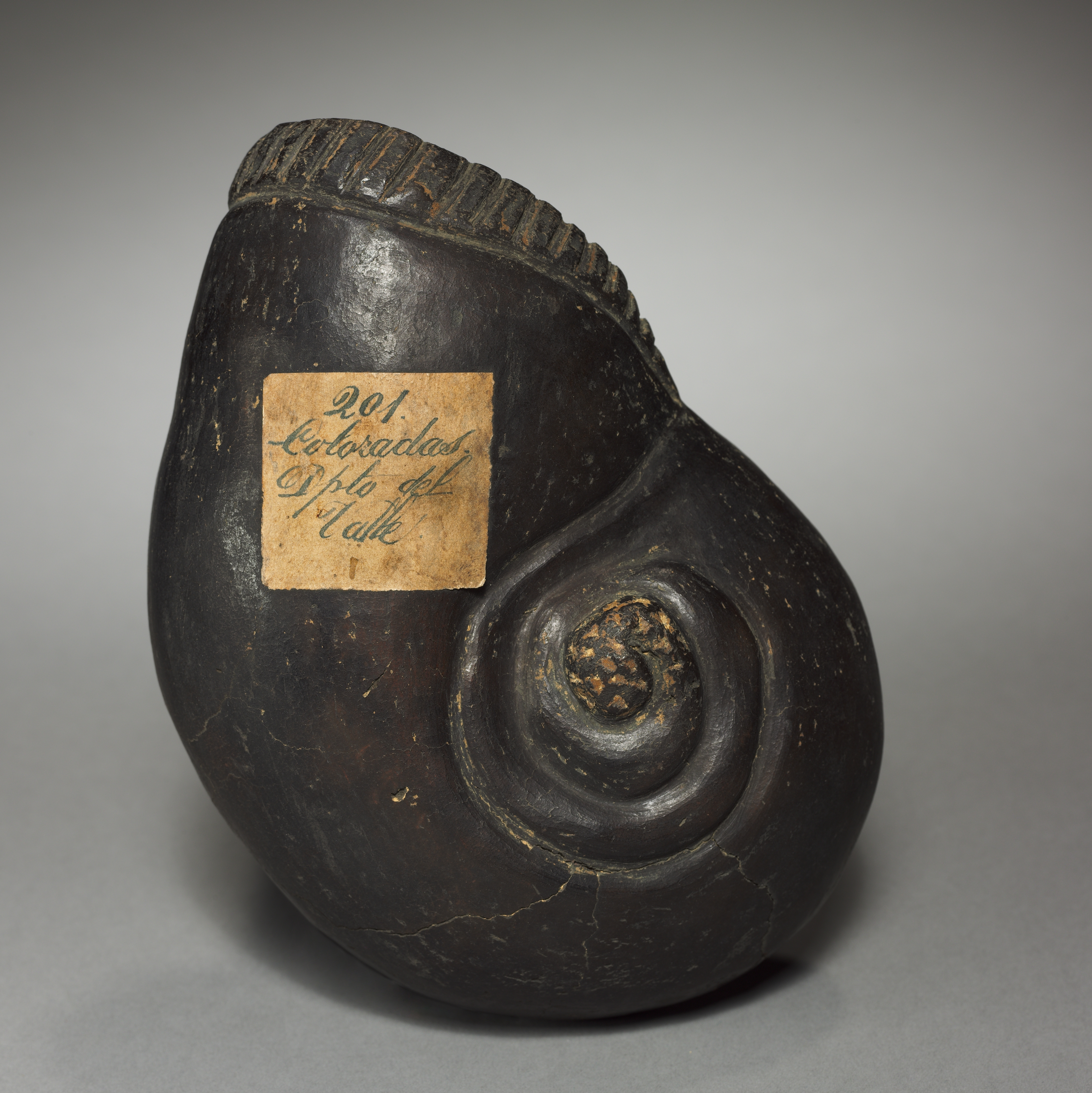 Dark brown or black colored object, resembling a snail shell; teardrop shape with spiral on right; ridged edge at top; small rectangular paper label with handwritten numbers and text; label reads "201 Coloradoa Pueblo Gelb alk"; object has visible cracks and scratches; sitting on gray surface with gradient background. Large Snail by Pablo Picasso.