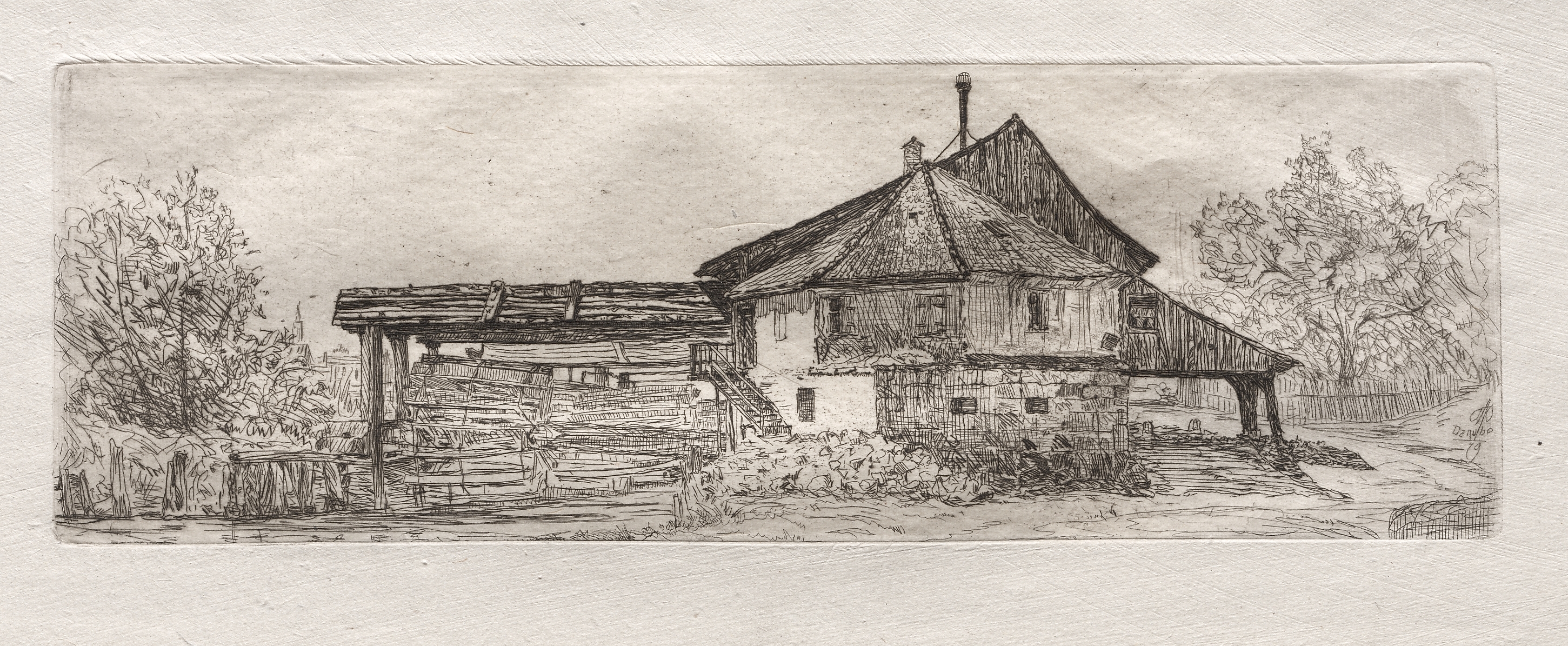 Old Mill on the Danube by Otto H. Bacher: A black and white sketch of a two-story building with a steep roof and chimney, featuring a smaller structure with a sloping roof to the left, surrounded by trees and a fence, with a body of water in front. The building appears to be old and weathered, with visible stone and wood textures. The roof of the main building is dark and possibly tiled or shingled. A dirt path leads to the right side of the building. The background shows a cloudy sky.