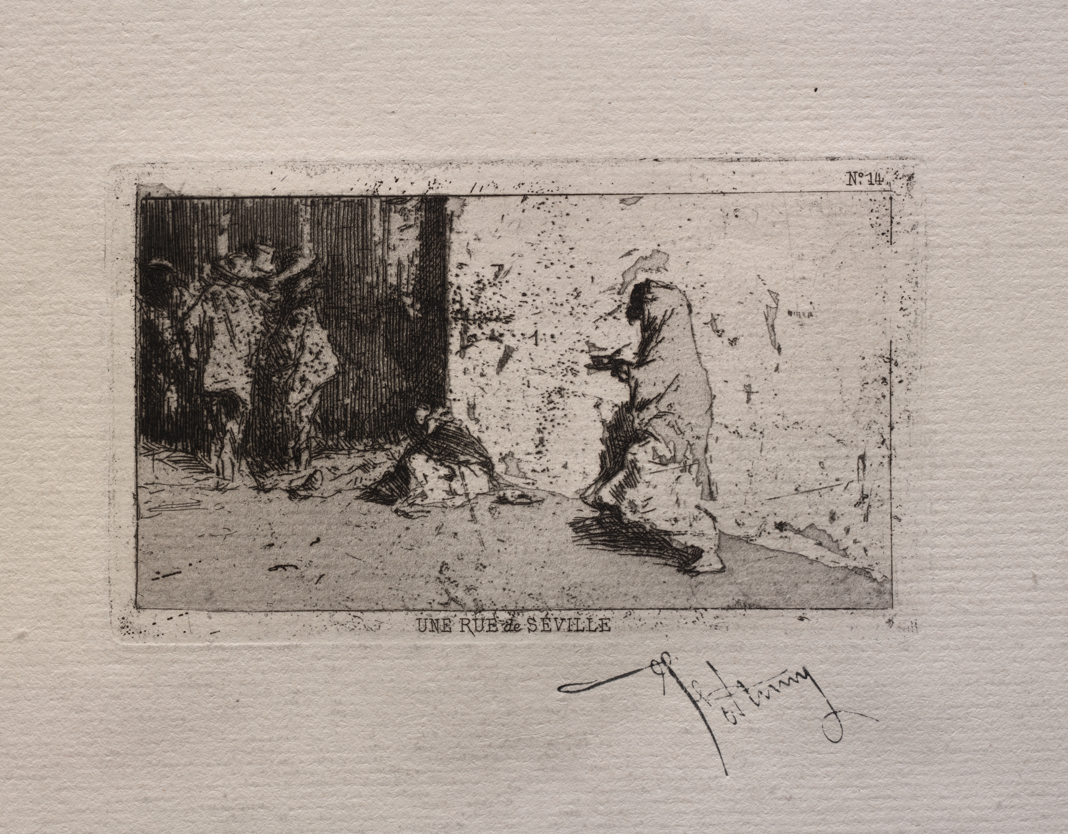 Black and white etching of a street scene. A woman wearing a long dress and a headscarf walks on the right. A seated figure is on the left, and another person stands further back on the left. The background features a building with an archway. Text at the bottom reads "UNE RUE A SEVILLE". The artist's signature is at the bottom. The artwork is set against a textured, off-white background.