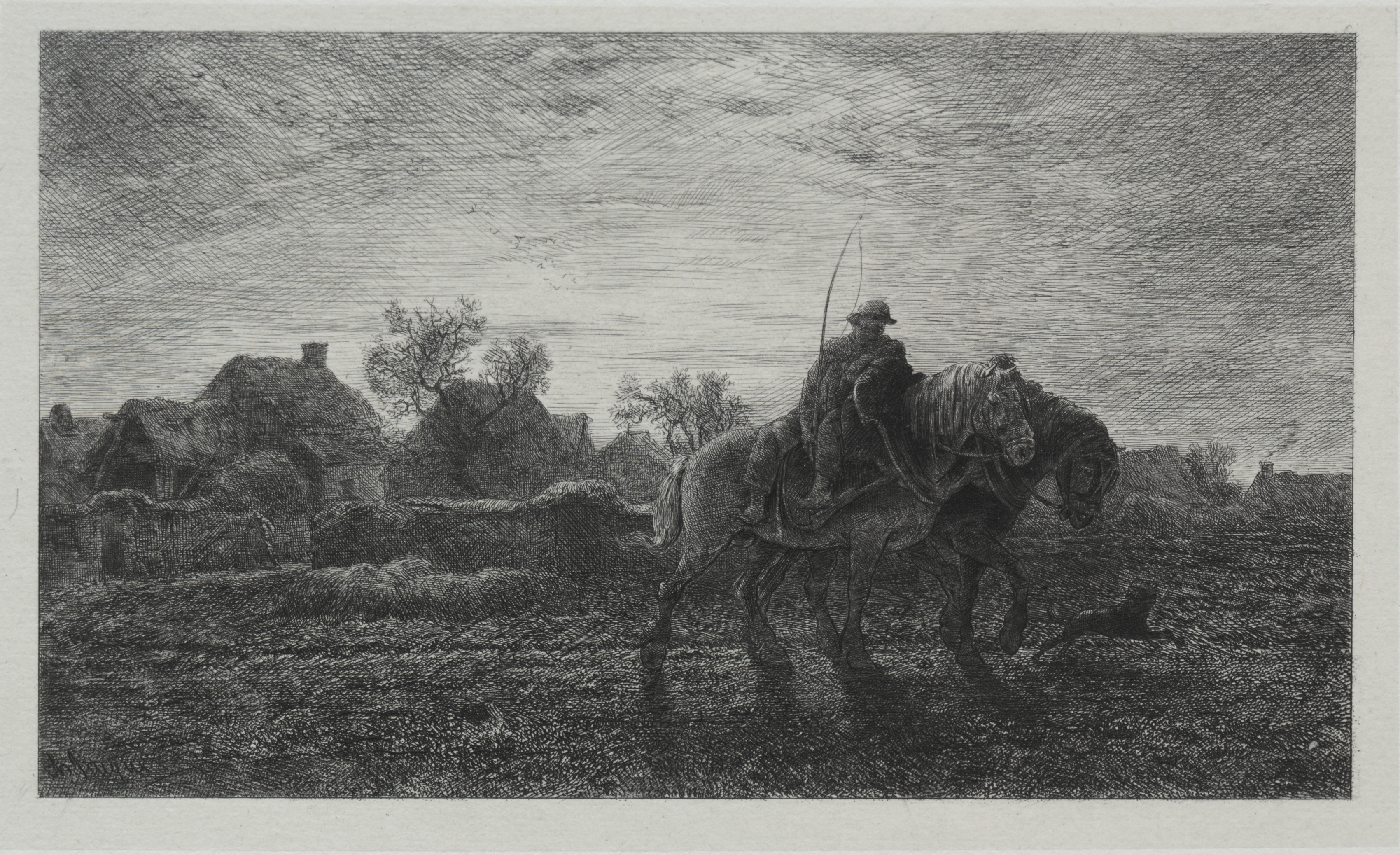 Black and white etching of a rural scene. A man rides a horse through a field with a whip in his right hand. The man wears a hat and a long jacket. The horse faces right. In the background, there are several farm buildings with thatched roofs and a few trees. A pile of hay or straw is on the left. The sky is cloudy. The scene is titled "The Morning" and is by Charles-Émile Jacque.