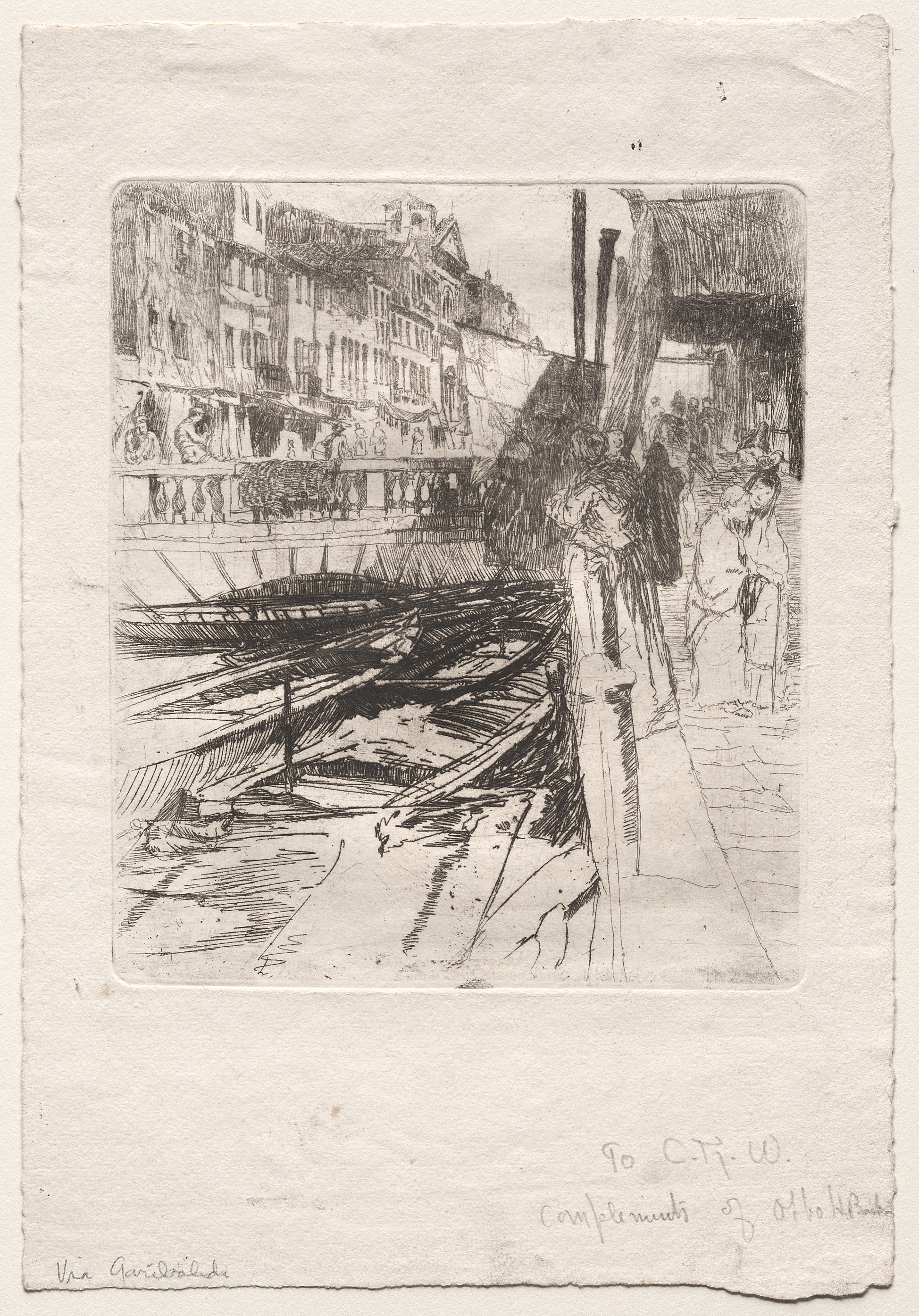 A black and white sketch of a waterfront scene with a woman standing on a sidewalk to the right. The woman wears a long dress and a hat. A railing separates the sidewalk from the water, where a boat is docked. The background features buildings with multiple stories and windows. The sidewalk and street are made of stone. The image is titled "Via Garibaldi" and is by Otto H. Bacher. The sketch is on off-white paper with a rough edge. There is a dedication to "C.H.W." in the bottom right corner. The sketch is signed in the bottom left corner.