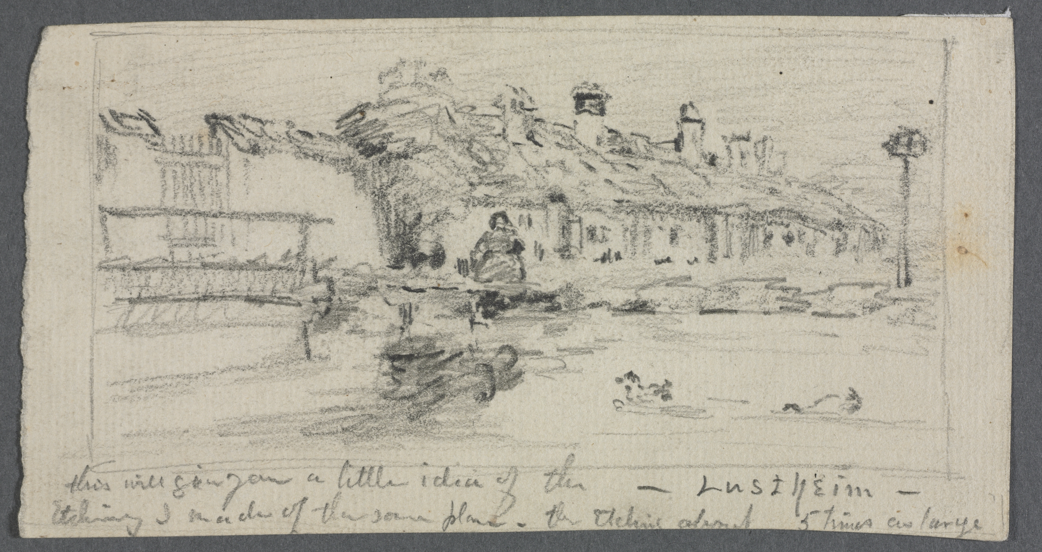 The image depicts a pencil sketch on beige paper titled "Lustheim" by Otto H. Bacher. The sketch features a landscape with buildings on a hillside and water in the foreground. The buildings are drawn on the right side, with chimneys visible on the rooftops. On the left side, there appears to be a bridge or walkway over the water. The water is depicted with some lines suggesting movement or ripples. There are some illegible handwritten notes at the bottom of the paper. The edges of the paper are rough and uneven. The background behind the paper is dark gray.