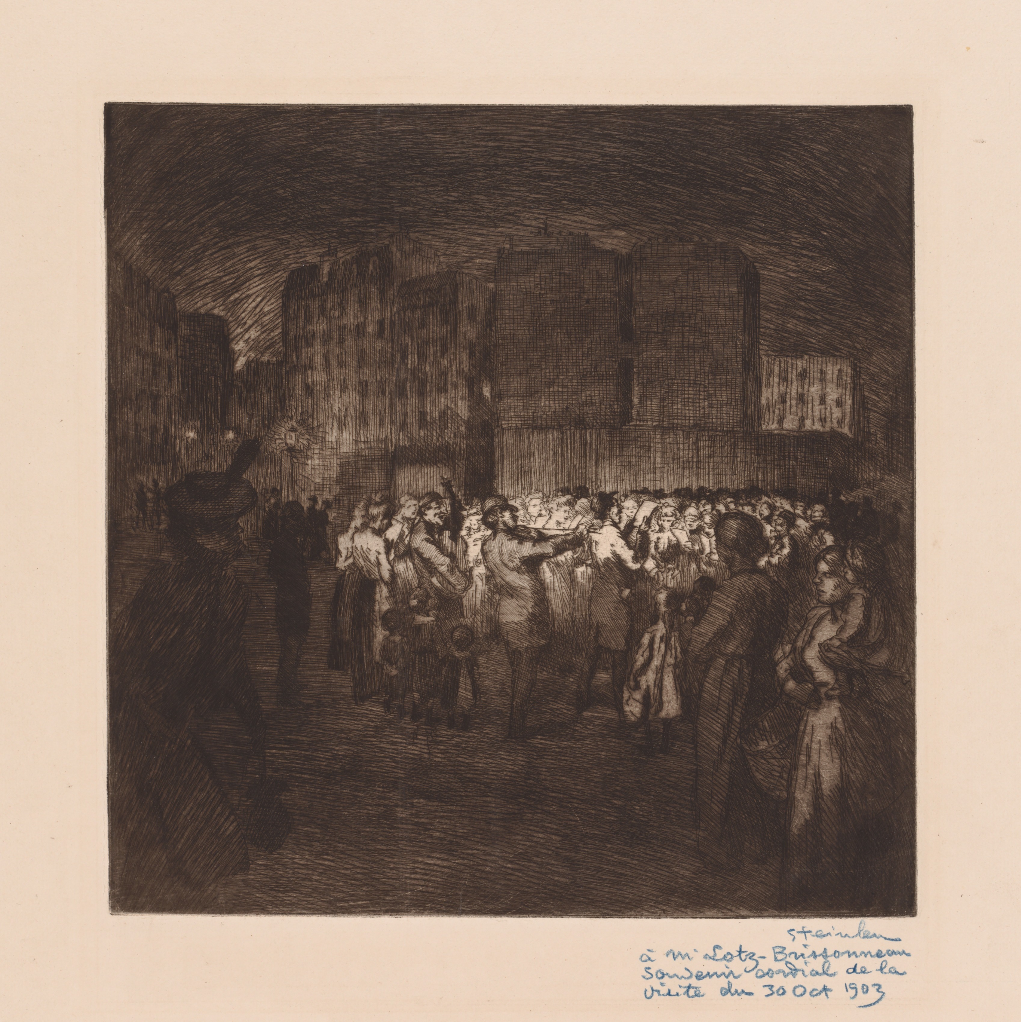 The image depicts a dark scene with a crowd of people gathered in an indoor setting. A man on the left side of the image faces the right; he wears a hat with a wide brim and a long coat. A man on the right side of the image faces left; he wears a long dress. Between them is a large group of people gathered around two central figures playing instruments. The background features tall buildings with many windows. The entire image is rendered in dark brown and black lines on a beige background. A blue handwritten note at the bottom right corner includes a date, "30 Oct 1903."