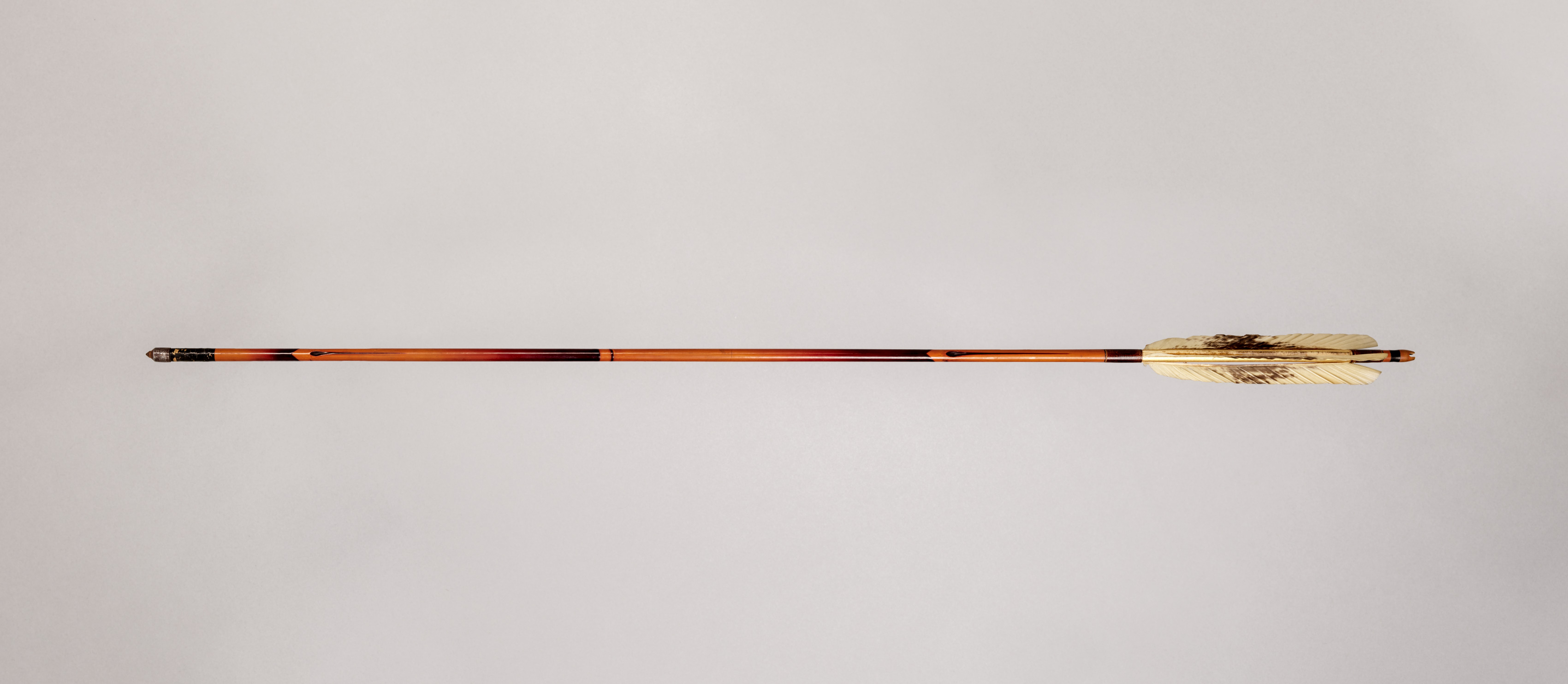 The image shows a straight, thin object with a pointed metal tip on the left and three feathers on the right. The object is titled "Arrow" and is by an artist. The object is long and straight with a metallic point on the left end. The shaft is colored with bands of red, orange, yellow, and black. The right end has a bundle of three long white and brown feathers, each with a long quill and vanes on either side. The quills are bound together with a thin string or wire. The background is a plain light gray color.