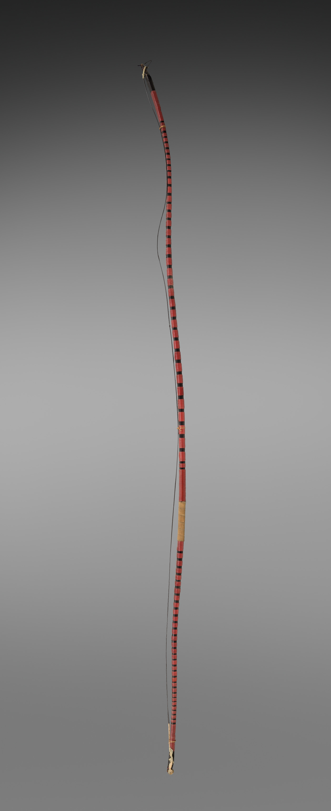 Red and black checkered bow with gold tips. Black bowstring. Wooden section near bottom. Gradient background from dark to light gray. Artist: "Bow".