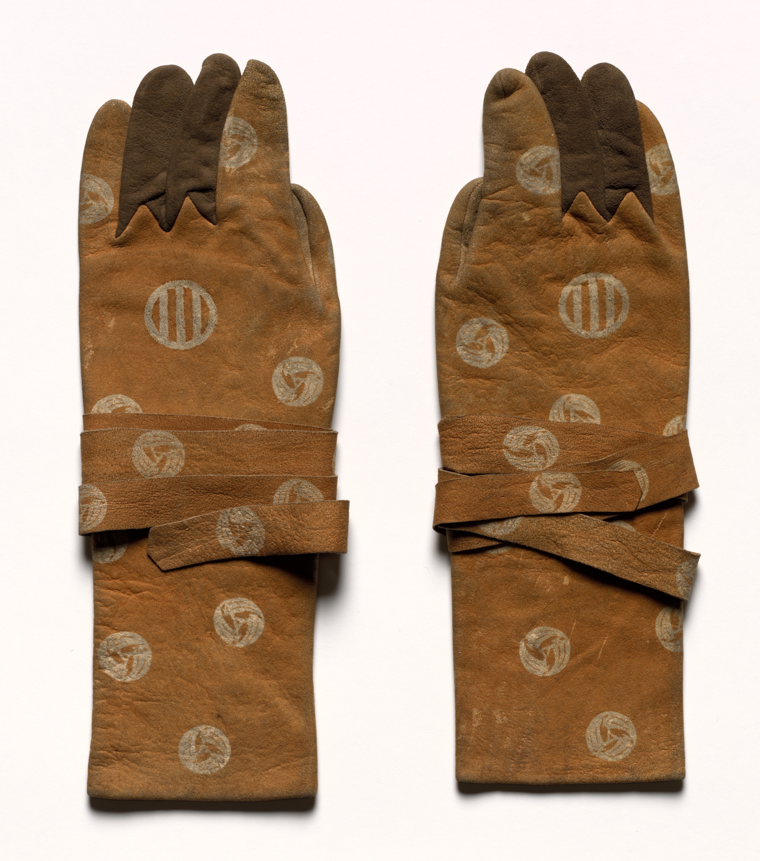 Brown leather gloves with a design of beige circular patterns, four fingers on each glove separated at the top; the gloves have leather straps; the tips of the fingers are darker leather; Pair of Archer's Gloves.