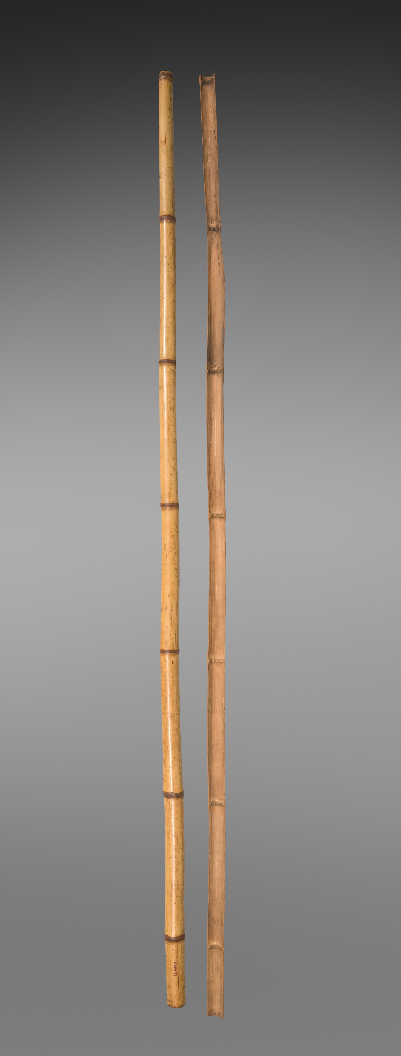 Two light-brown, cylindrical wooden sticks with multiple thin, darker brown rings around them, resembling bamboo. The stick on the right has a small notch at the top. The background transitions from black at the top to gray at the bottom. Title: Bow: cloth. Artist unspecified.