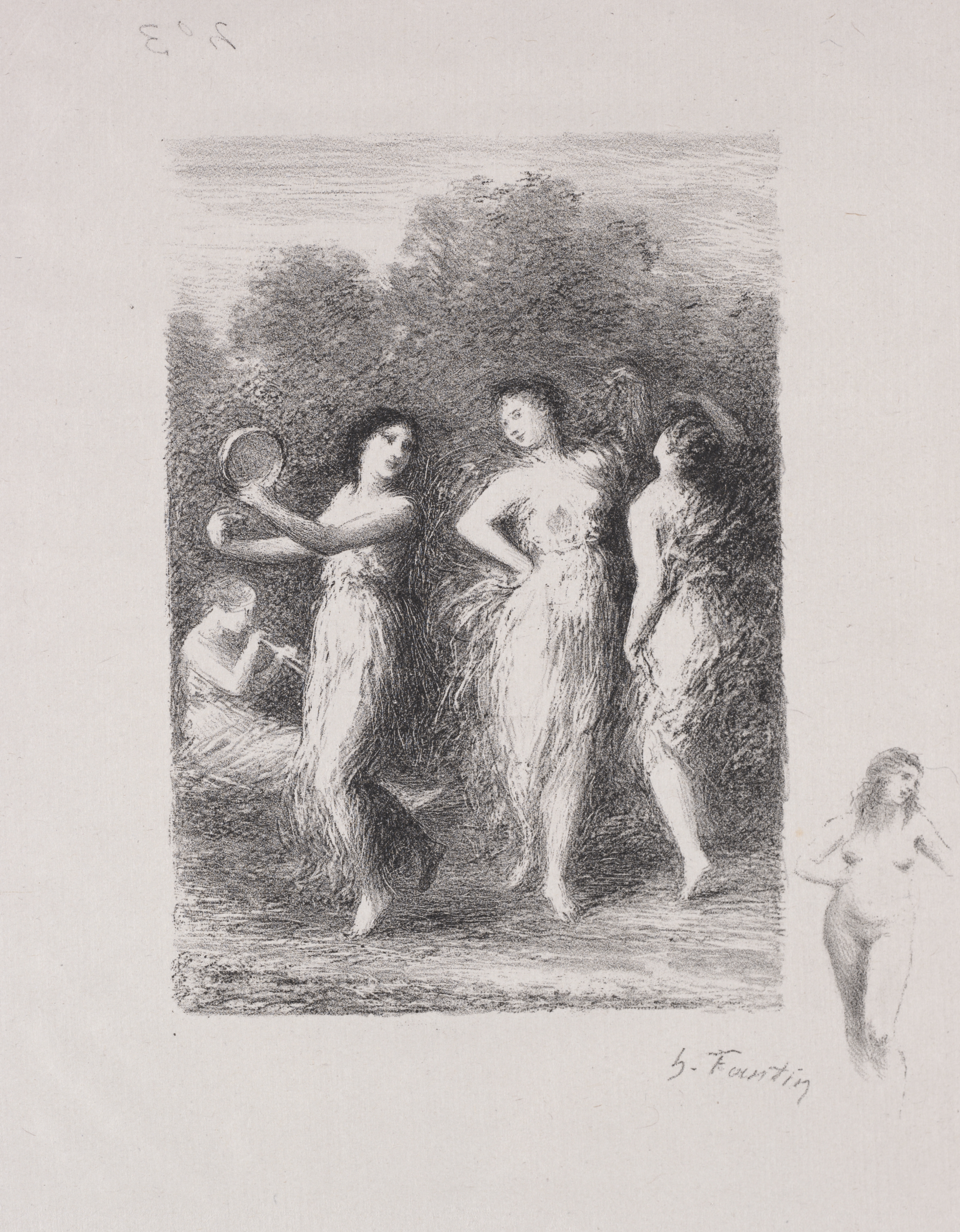 The image depicts a black and white drawing titled "La jeune malade" by Henri Fantin-Latour. The drawing shows four women, one sitting and three standing. The standing women wear long, flowing garments that appear to be made of light material, possibly sheer or semi-sheer. The woman on the left holds a mirror. The woman in the middle has her hand on her hip. The woman on the right has her head slightly bowed. The seated woman is on the far left. Trees and foliage are in the background behind the standing women. The background of the image is light-colored. The artist's signature appears at the bottom. A small, partially nude woman is drawn on the right side.