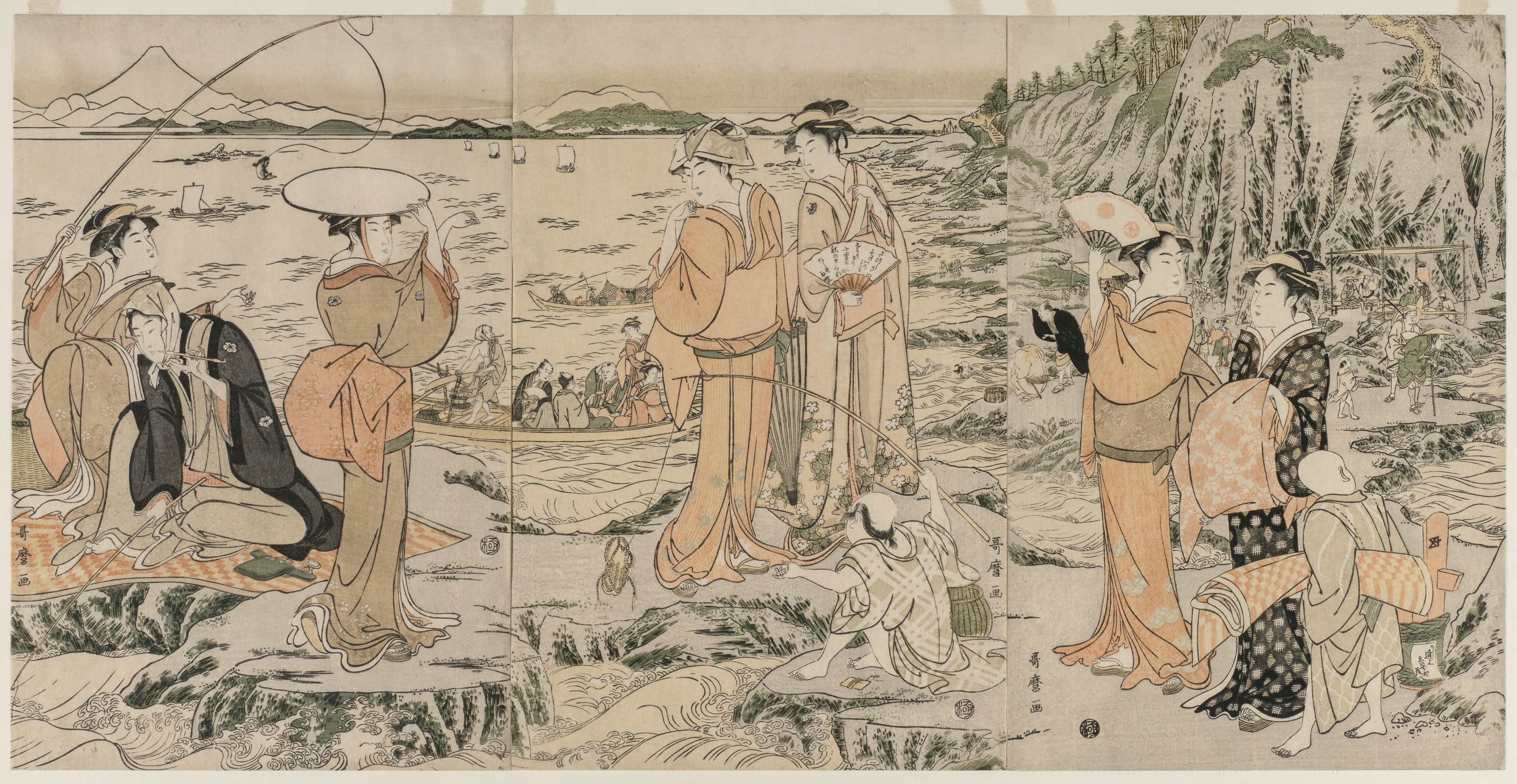 The image depicts a traditional Japanese woodblock print. The scene shows a group of women dressed in traditional Japanese kimonos. The women on the left side have light skin and wear various colors of kimonos, some are kneeling and some standing. One woman on the left holds a fishing rod. The background on the left features a body of water with boats and a mountain. The center and right side of the image show more women in kimonos, with one holding a parasol and another carrying a basket. There are trees on the right side of the image. The color palette is muted with shades of beige, brown, and black. The image is divided into three sections.