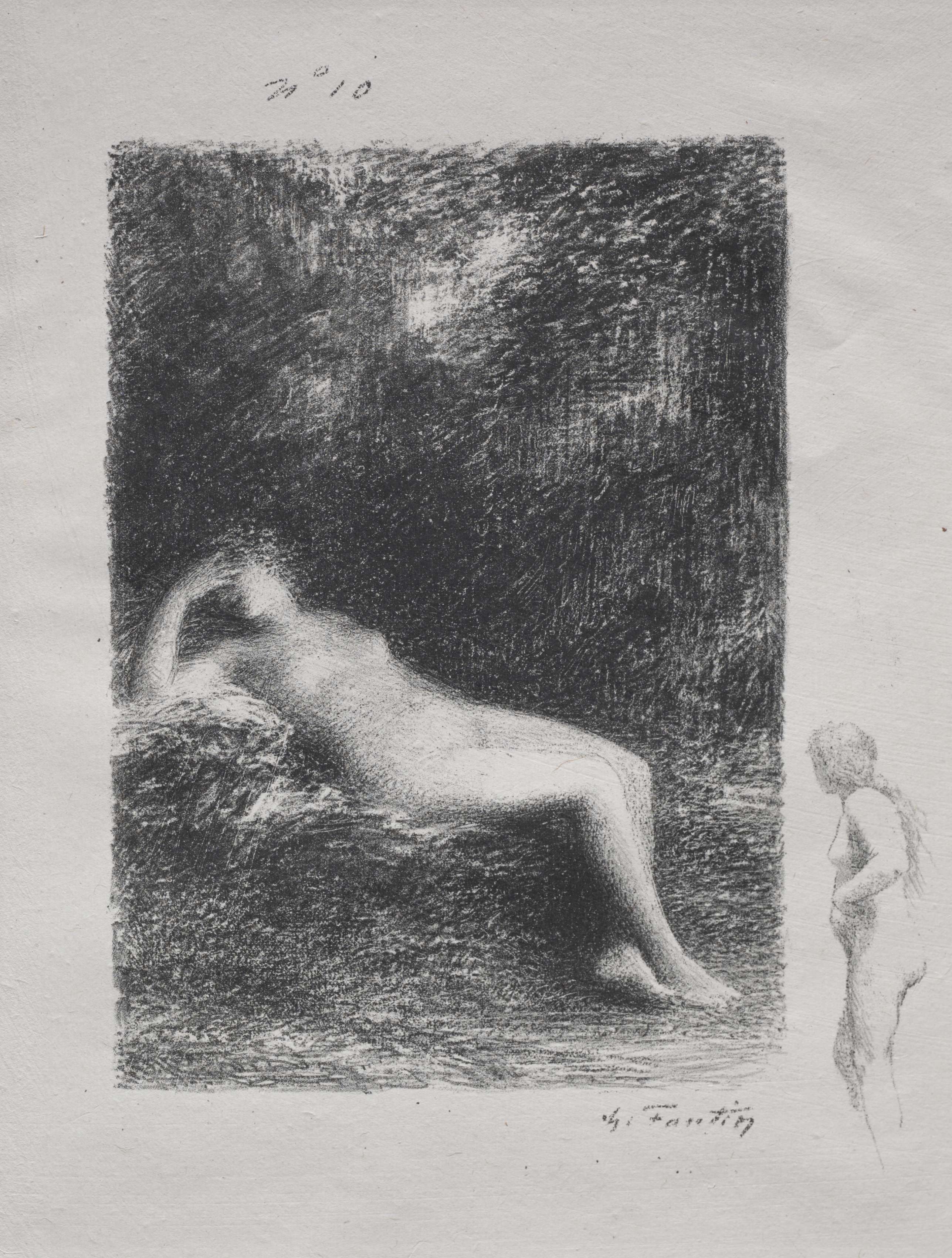 The image depicts a black and white drawing titled "XXVII" by Henri Fantin-Latour. The drawing is on gray paper with a darker grey rectangular area containing the main image. Inside the rectangle, a nude woman reclines on a surface, possibly a couch or a pile of rocks, with her left arm raised and bent at the elbow, and her right arm down by her side. The woman's face is not clearly visible. The woman's body is rendered in various shades of gray, with the lightest areas on her torso and limbs. The background of the rectangle is shaded darkly with many short lines. The woman's signature appears to be at the bottom center of the rectangle. To the right of the rectangle is a smaller, fainter drawing of a standing nude woman with long hair, facing left. The background of the paper is light gray, with a small notation at the top center. The overall style of the drawing is detailed and realistic.