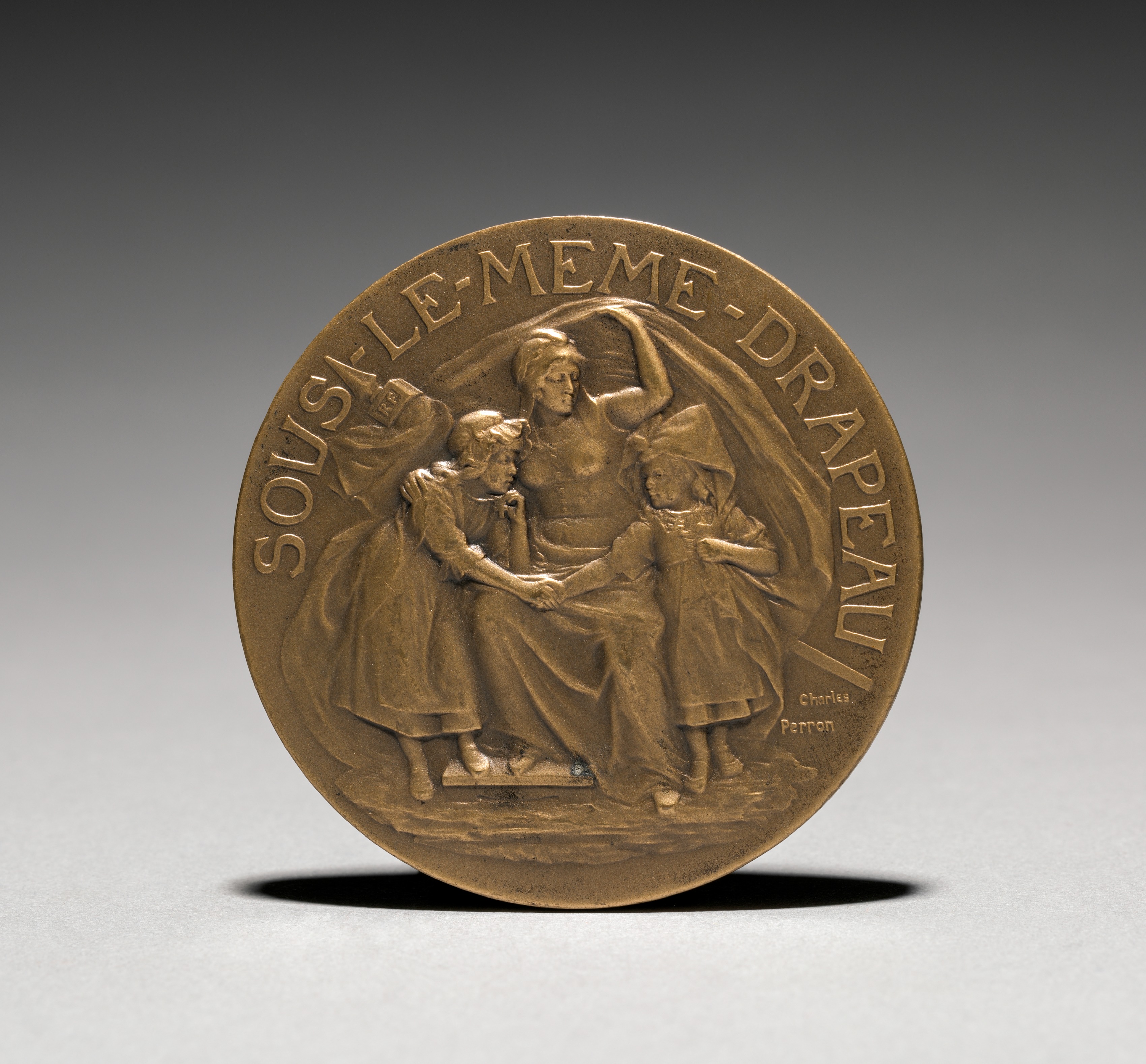 Bronze-colored medallion with raised images. A woman sits on a low platform holding a cloth over her head with one hand and holding hands with two small children on either side of her with the other hand. The woman wears a long dress and head covering. The child on her right wears a dress and head covering. The child on her left wears a dress. The medallion reads, "SOUS LE MEME DRAPEAU" along its outer edge. Small engraved text to the bottom right reads, "Charles Perron".
