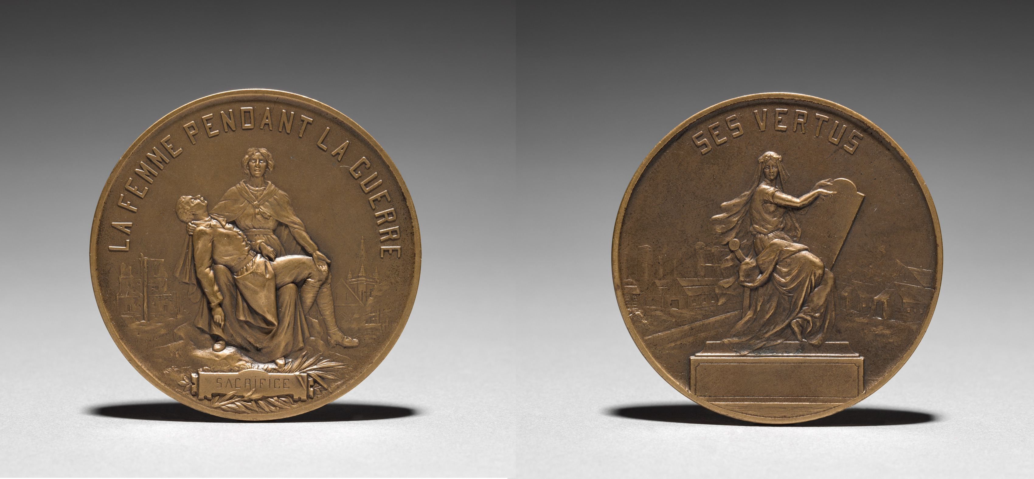 The bronze medallion has two sides. The left side shows a woman sitting and holding a wounded man. The woman wears a long dress and cloak. The man wears military uniform and has a bandage on his head. The background includes buildings and ships. The words "LA FEMME PENDANT LA GUERRE" are written around the top edge. The right side shows a woman sitting on a pedestal holding a flag or scroll. The woman wears a long, flowing dress. The background includes buildings. The words "SES VERTUS" are written around the top edge. The medallion's surface appears to be bronze-colored. The medallion is displayed on a gray background. The medallion's shape is circular. The text is raised. The medallion has a 3D appearance.