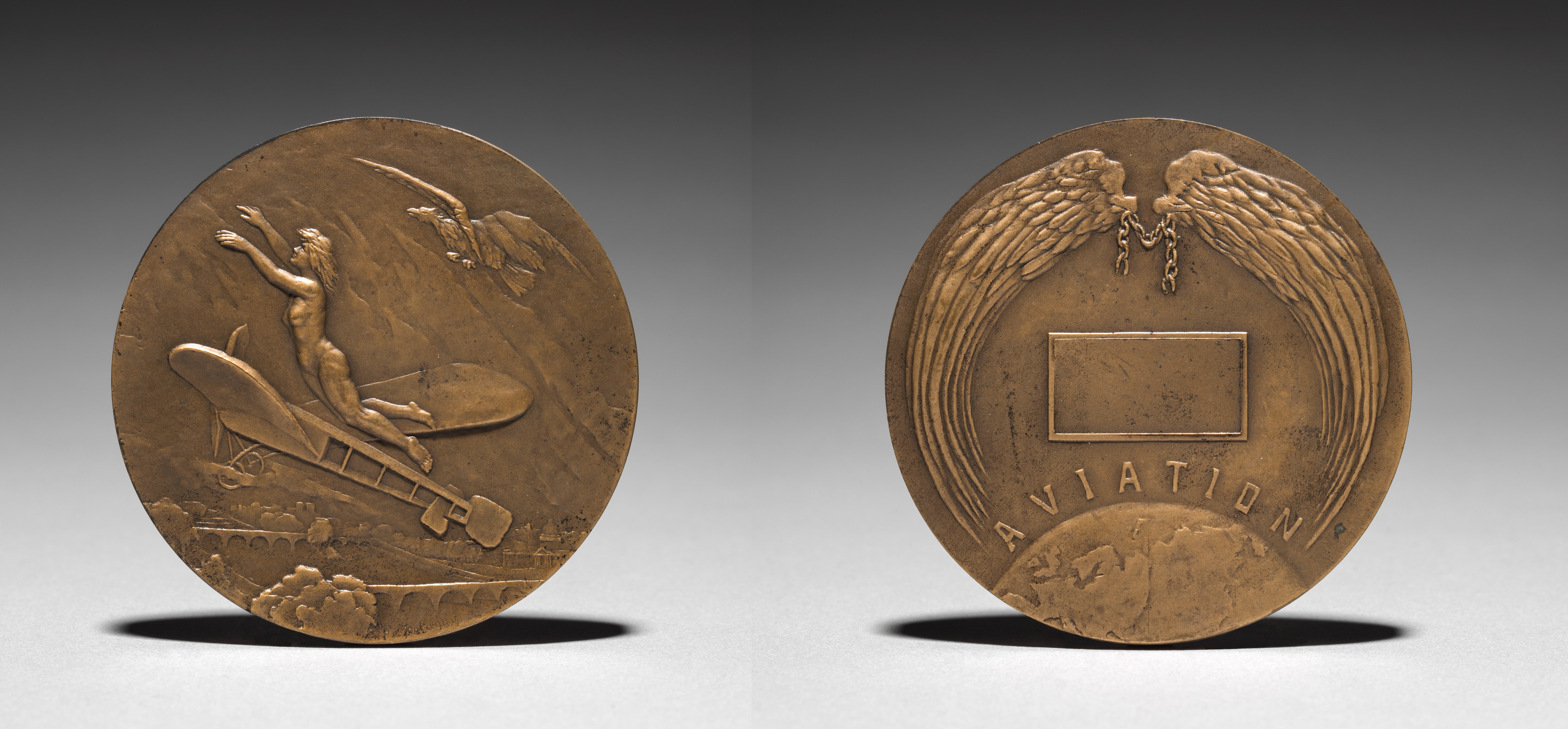Medal by F. Montagny. Circular bronze medal with two distinct sides. The left side features a raised relief of a nude man with arms outstretched jumping off a biplane; the plane has a ladder extended and is flying low over a landscape; the man has wings spread wide in the upper right. The right side features a square in the center; above the square are wings with a medal hanging from them; below the square are the words "AVIATION" with a semi-circle underneath.