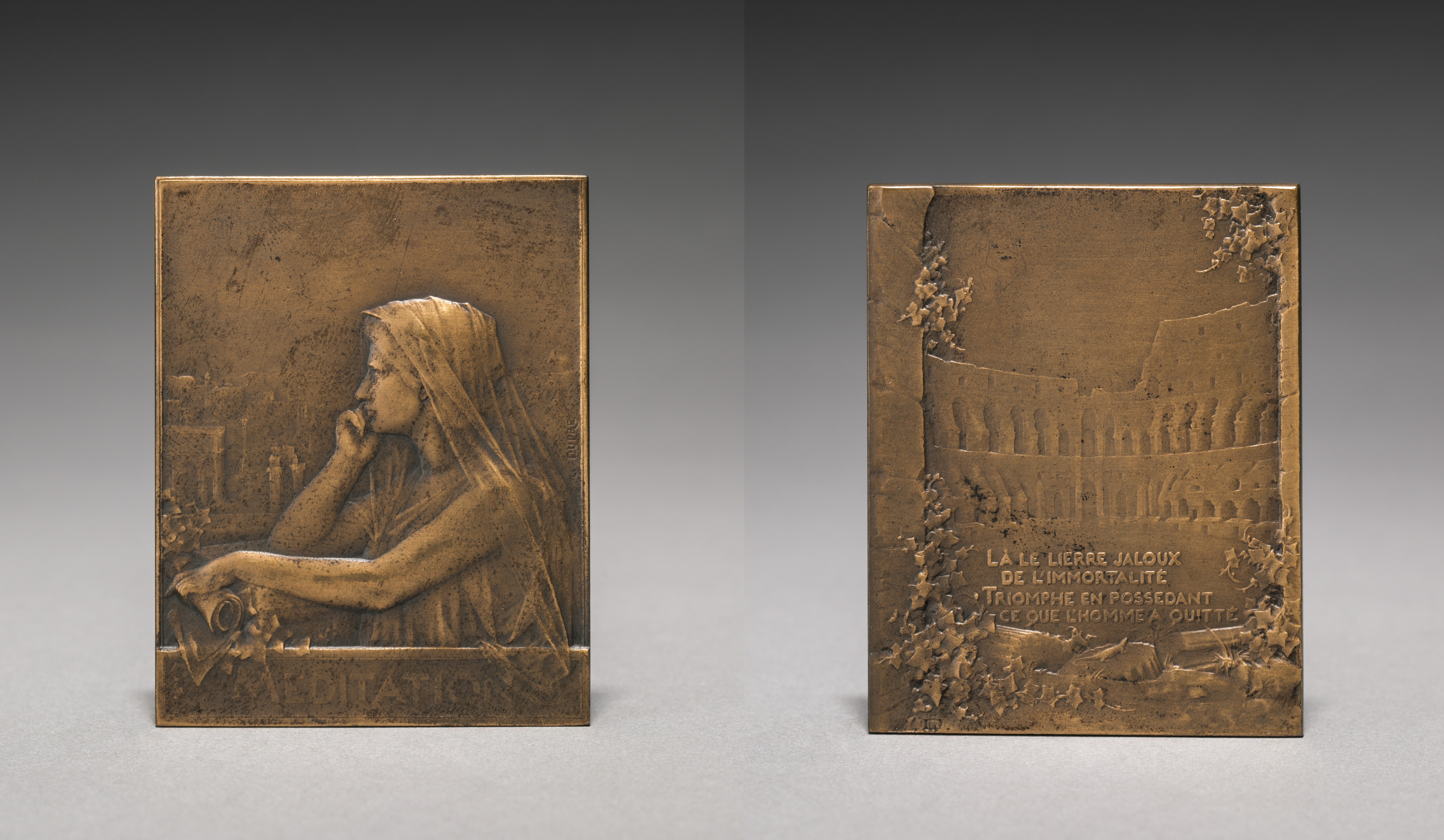 Medallion by Georges Dupré. Rectangular bronze plaque with a relief on both sides. The left side relief depicts a woman with her head covered, facing left. Her right elbow rests on a surface and her hand supports her head. She looks ahead. A portion of a cityscape appears behind her. The right side relief features an architectural colonnade with multiple columns and a row of statues. The colonnade is adorned with foliage on the right side. Inscriptions are present on both reliefs. The background behind the plaques transitions from dark to light gray.