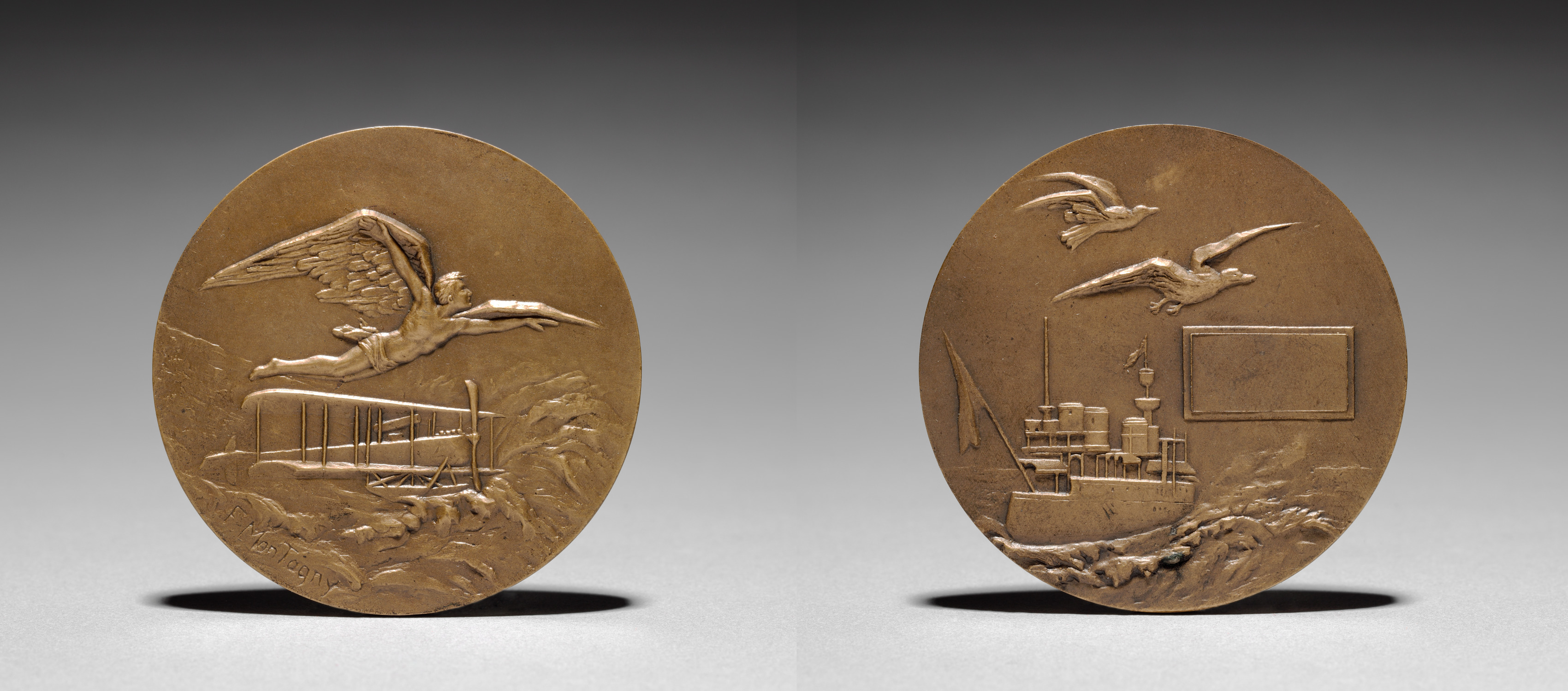 Medallion by F. Montagny. Two bronze-colored, circular medallions are shown side by side. The left medallion features a raised relief of a winged man flying over a biplane. The man has wings protruding from his back and is outstretched horizontally. The biplane appears to be flying low over a ground with hills. The right medallion depicts a large ship with multiple stacks and a flag on the left. On the right is an empty rectangular plaque. In the background are waves and a bird flying over the ship. A bundle of wheat-like stalks appears on the bottom right. Two flying birds appear over the ship. The background of the image is a gradient from dark at the top to light at the bottom with the medallions casting a shadow to the bottom left.