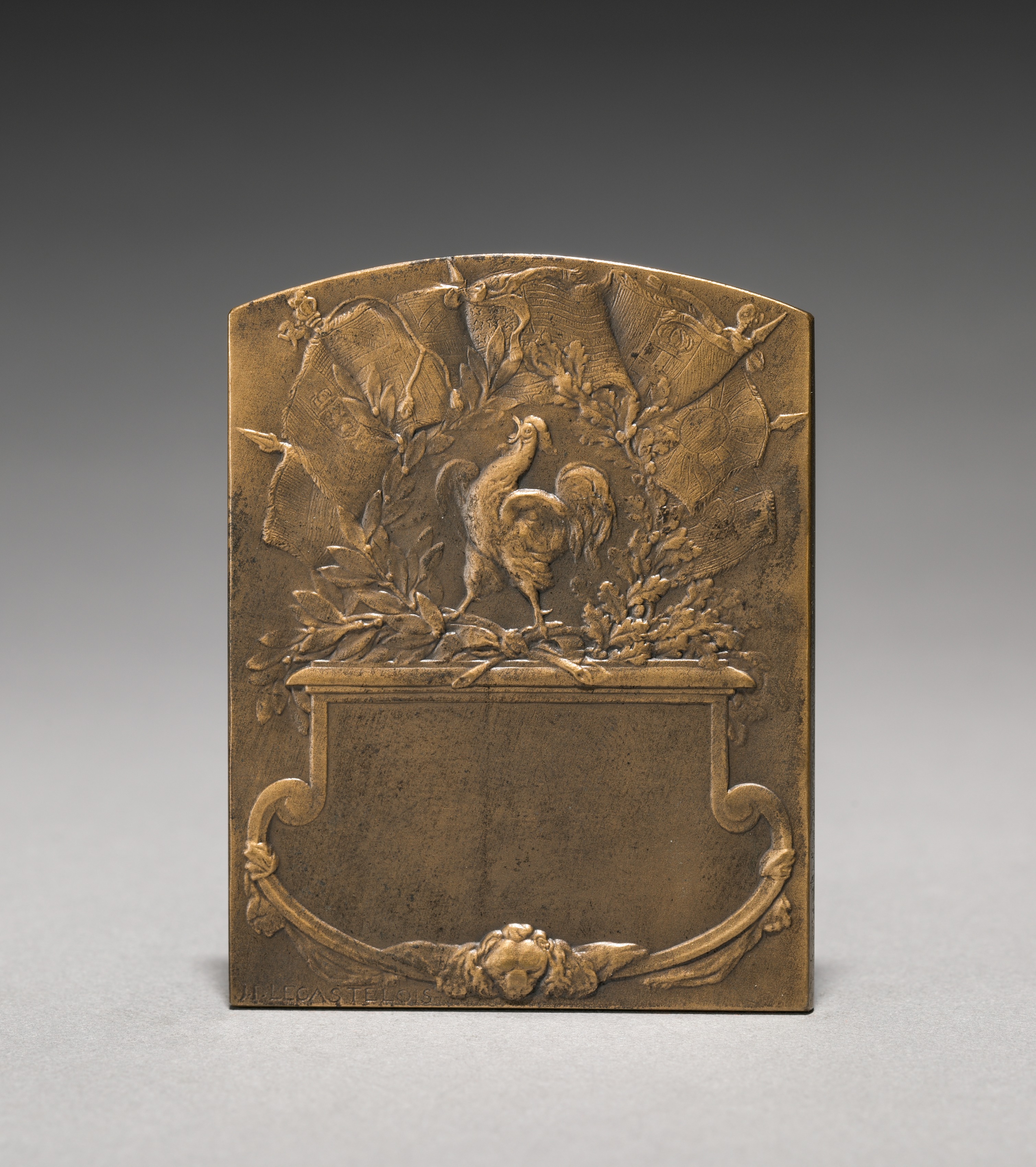 Bronze plaque with a rounded top. A rooster stands on a ledge, surrounded by foliage and ribbons. The ledge has scrollwork on either side and a lion's head at the bottom center. The background features flags and additional foliage. The plaque sits on a gray surface against a dark gray background.