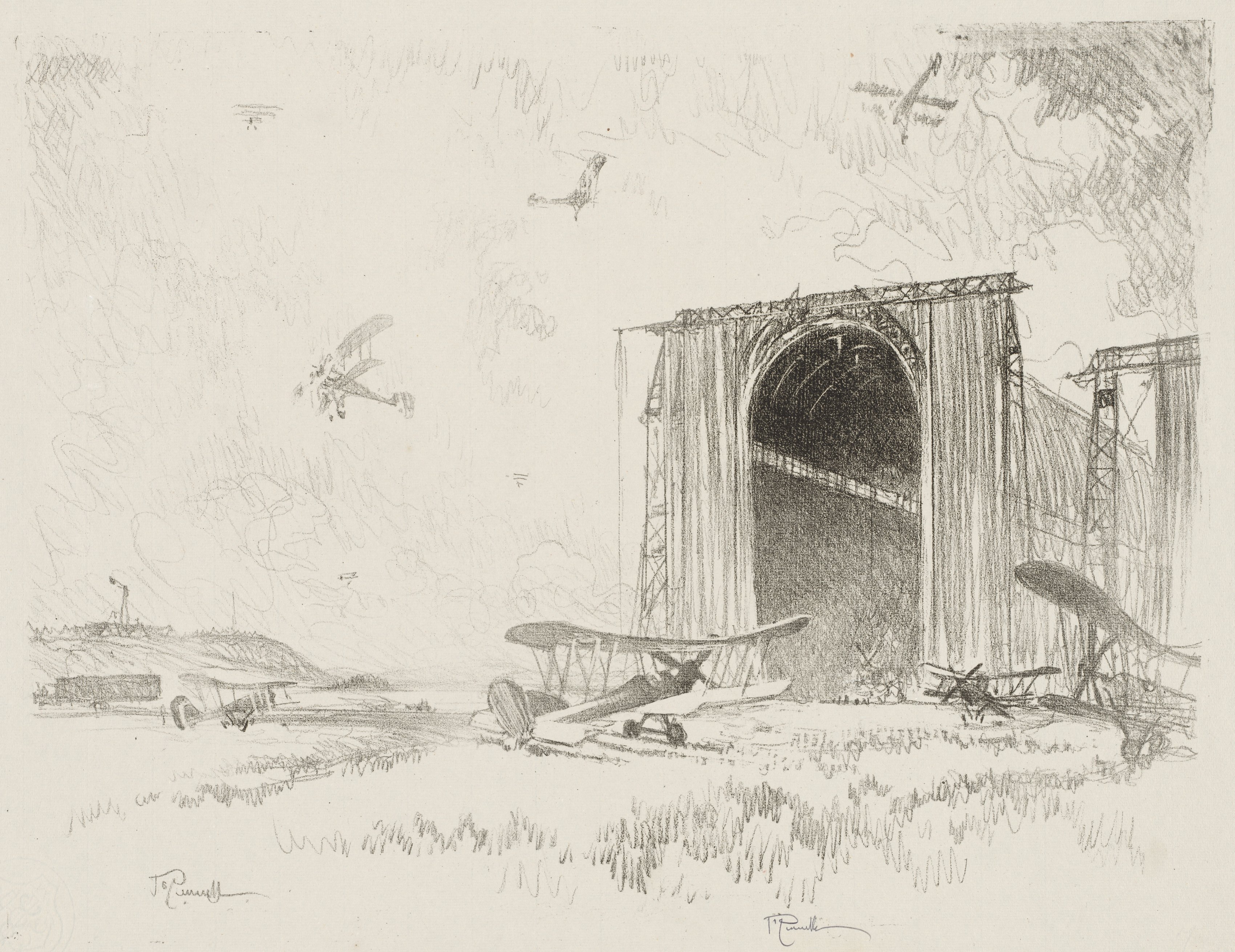 The image depicts a sketch of a large hangar with biplanes outside. The hangar is on the right, with a large, rounded opening, resembling an archway; the opening appears dark inside. The hangar's exterior is made of metal panels. Three biplanes are parked in front of the hangar; one is centered, and the other two are on the right and left sides. Additional biplanes are flying in the air above the hangar and to the left. The sky is filled with clouds. The artist's signature appears twice at the bottom. The overall color of the image is a light beige.