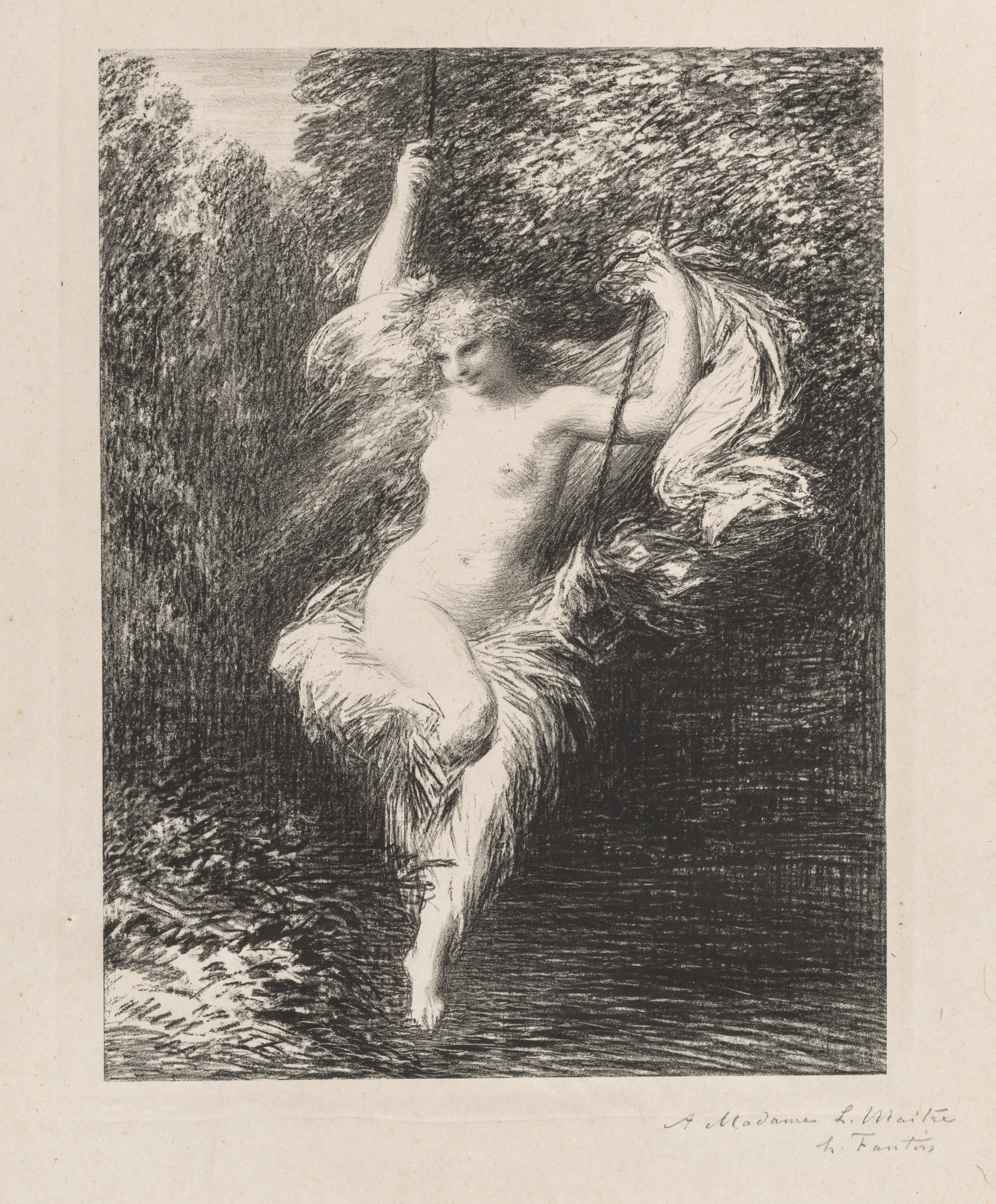 Black and white drawing of a nude woman swinging on a vine over a body of water. The woman has her arms raised above her head holding onto the vine with both hands. Her hair and a cloth are flowing behind her. Trees are on the left side and behind her. The woman's body faces left; her head is tilted down and turned to face the viewer. Her left leg is bent at the knee and behind her; her right leg is straight and lowered. A signature is in the bottom-right corner. Sarah la Baigneuse by Henri Fantin-Latour.
